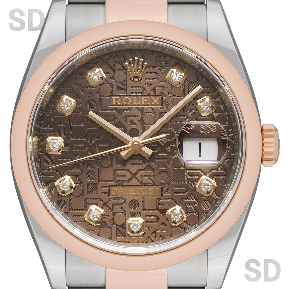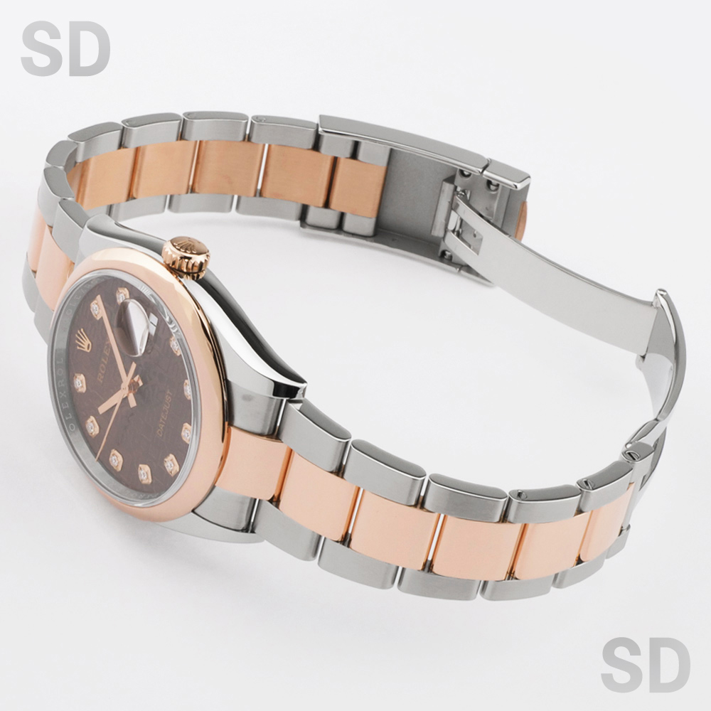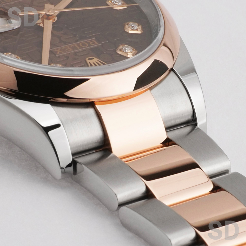 本モデルは、エバーローズゴールドとステンレススチールを組み合わせたロレゾール(コンビ)仕様を採用。ツルっとしたドーム型のスムースベゼルに、堅牢性の高いオイスターブレスレットが装着され、文字盤にはすでに生産が終了しているROLEXのモチーフが繊細にあしらわれたチョコカラーのコンピューターを配し、インデックスには上質なダイヤモンドをセッティングされ、華やかさの中に気品を感じさせる洗練された佇まいが魅力の時計でございます。