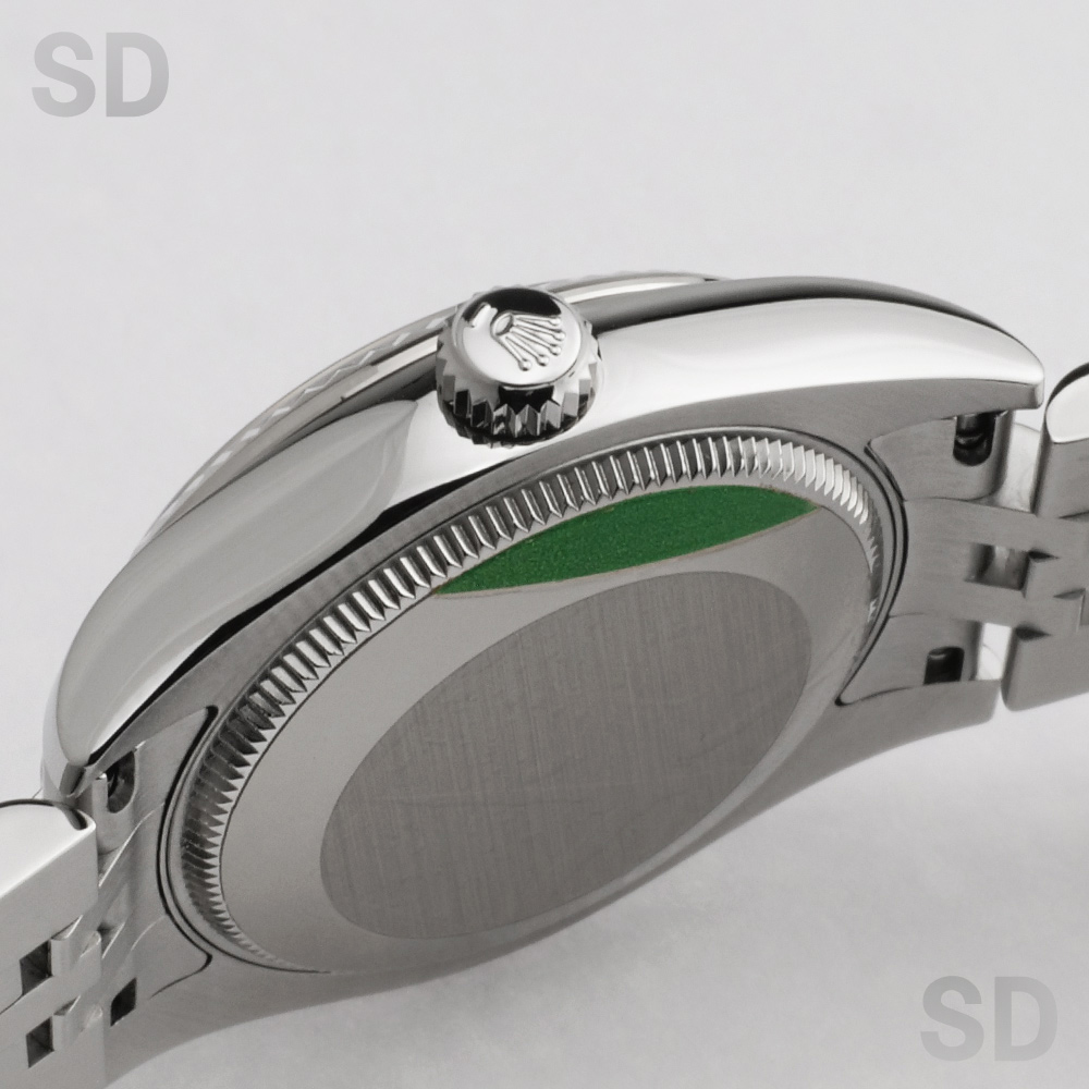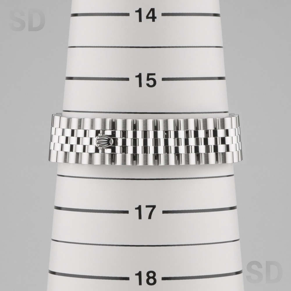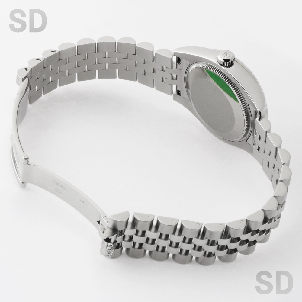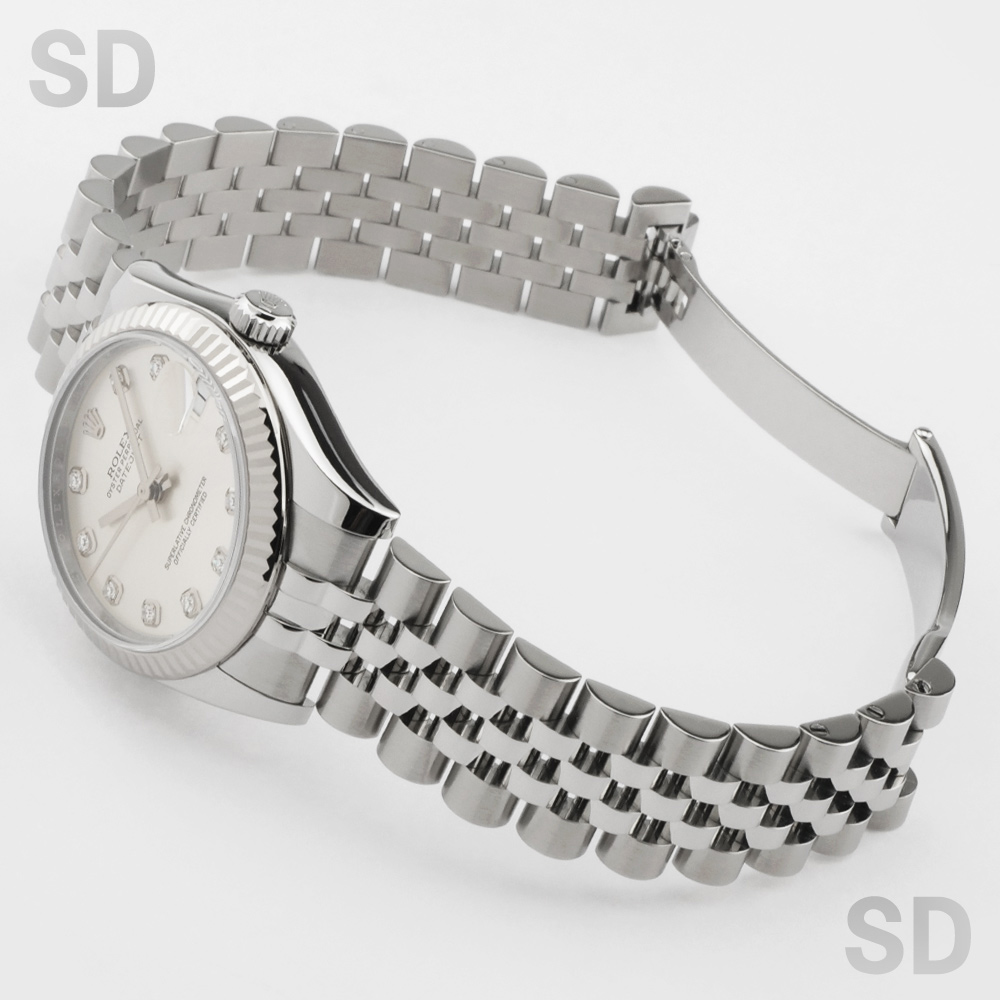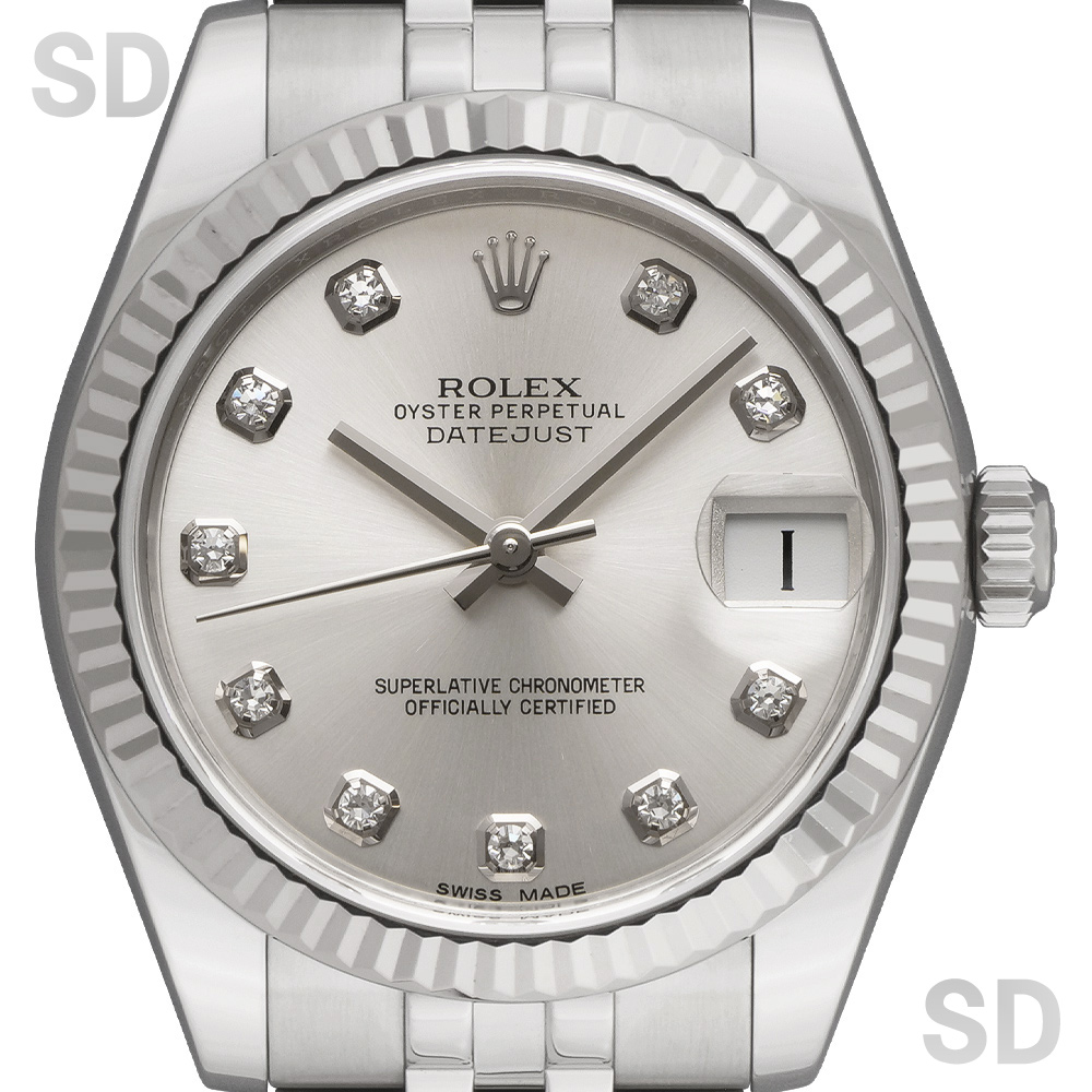 フルーテッドベゼルにジュビリーブレスレットを装備したこちらのモデルは、古くから愛されるデイトジャストを象徴するデザイン。当初は男女兼用サイズとされた31mmケースですが、現在では少し大きめのサイズをお好みになる女性向けのラインナップとされているイメージです。定番のシルバー文字盤にダイヤモンドが目を惹く1本。腕元を華やかに彩るアクセサリーとしても最高のモデルであり、スタイルは気にせず着用出来る上品なモデルです。