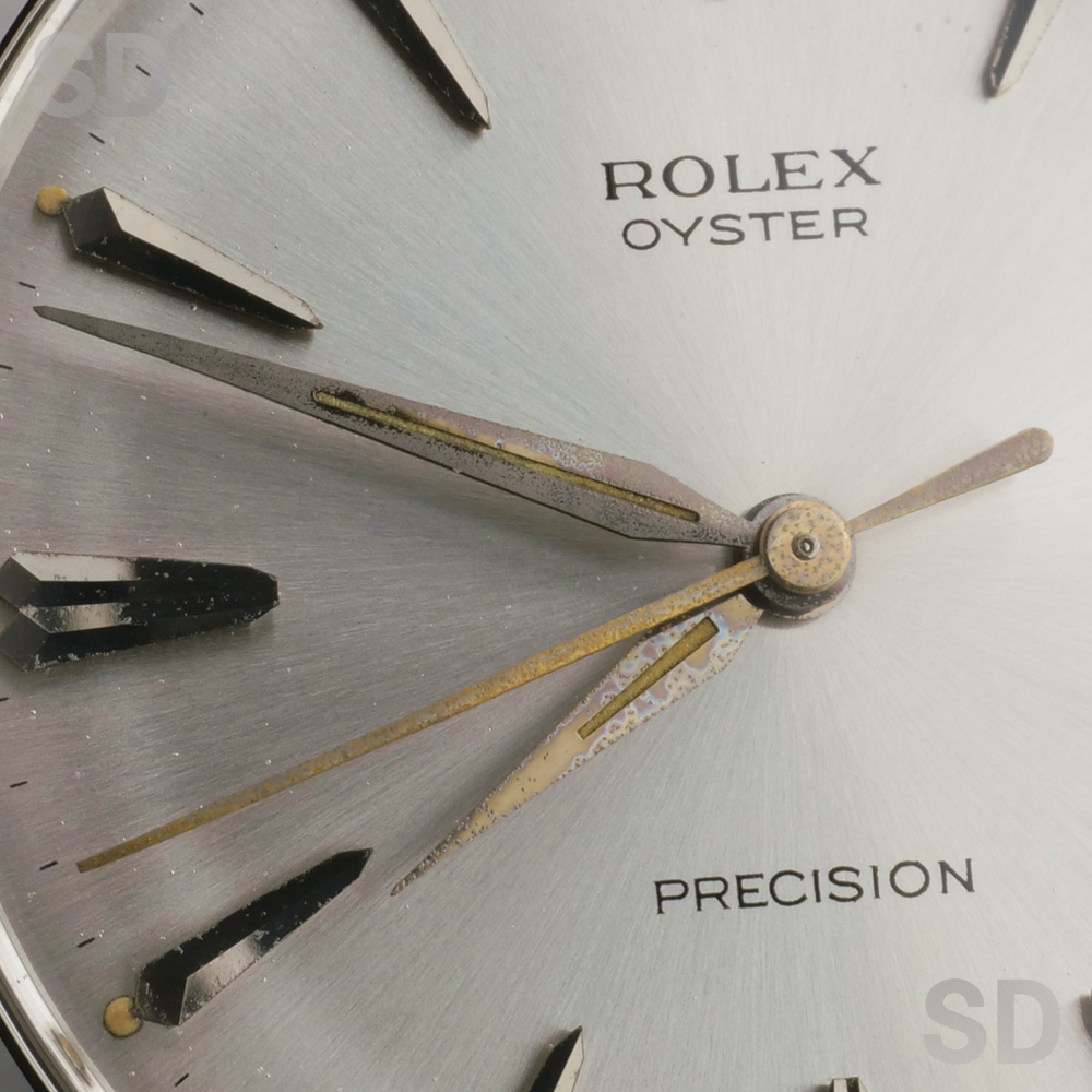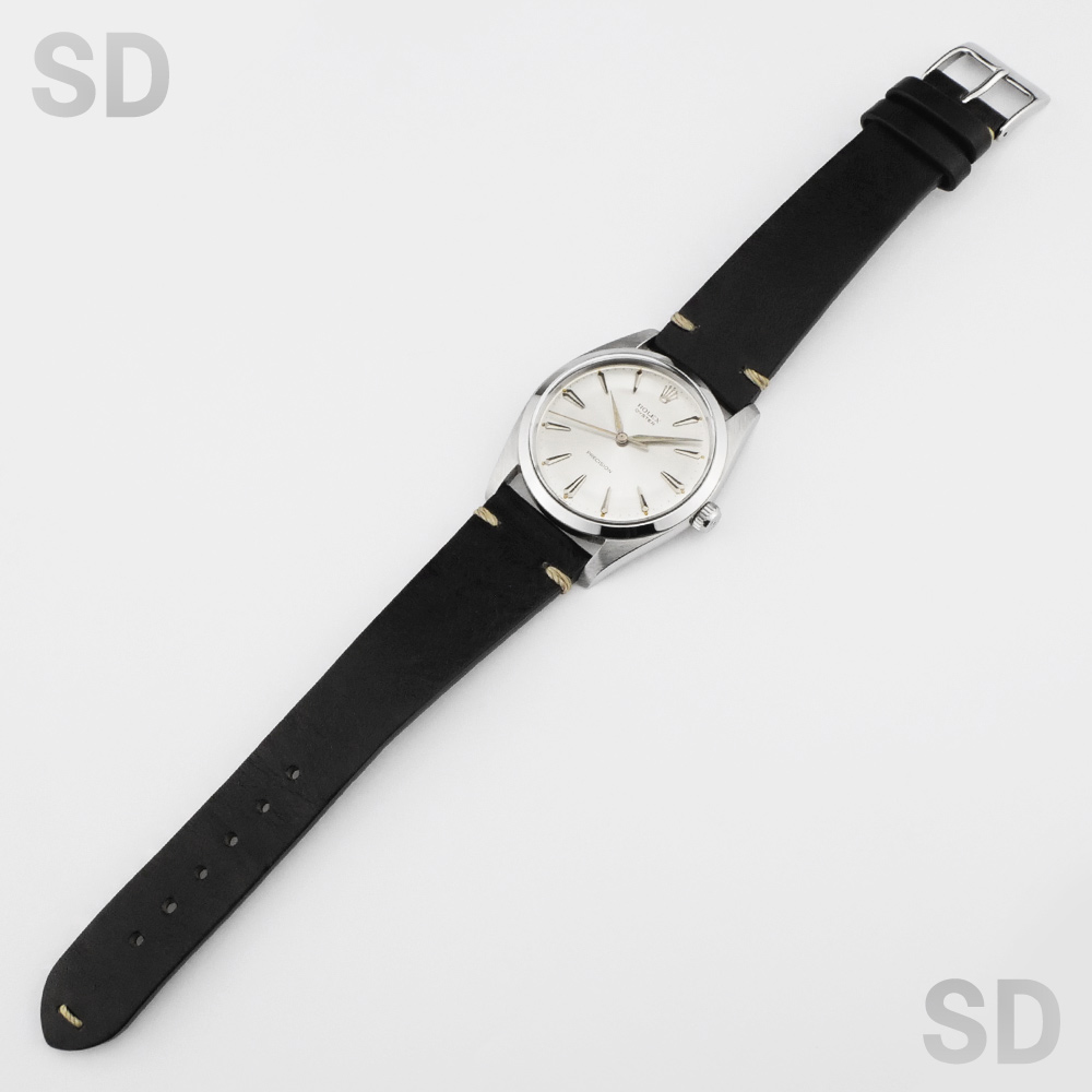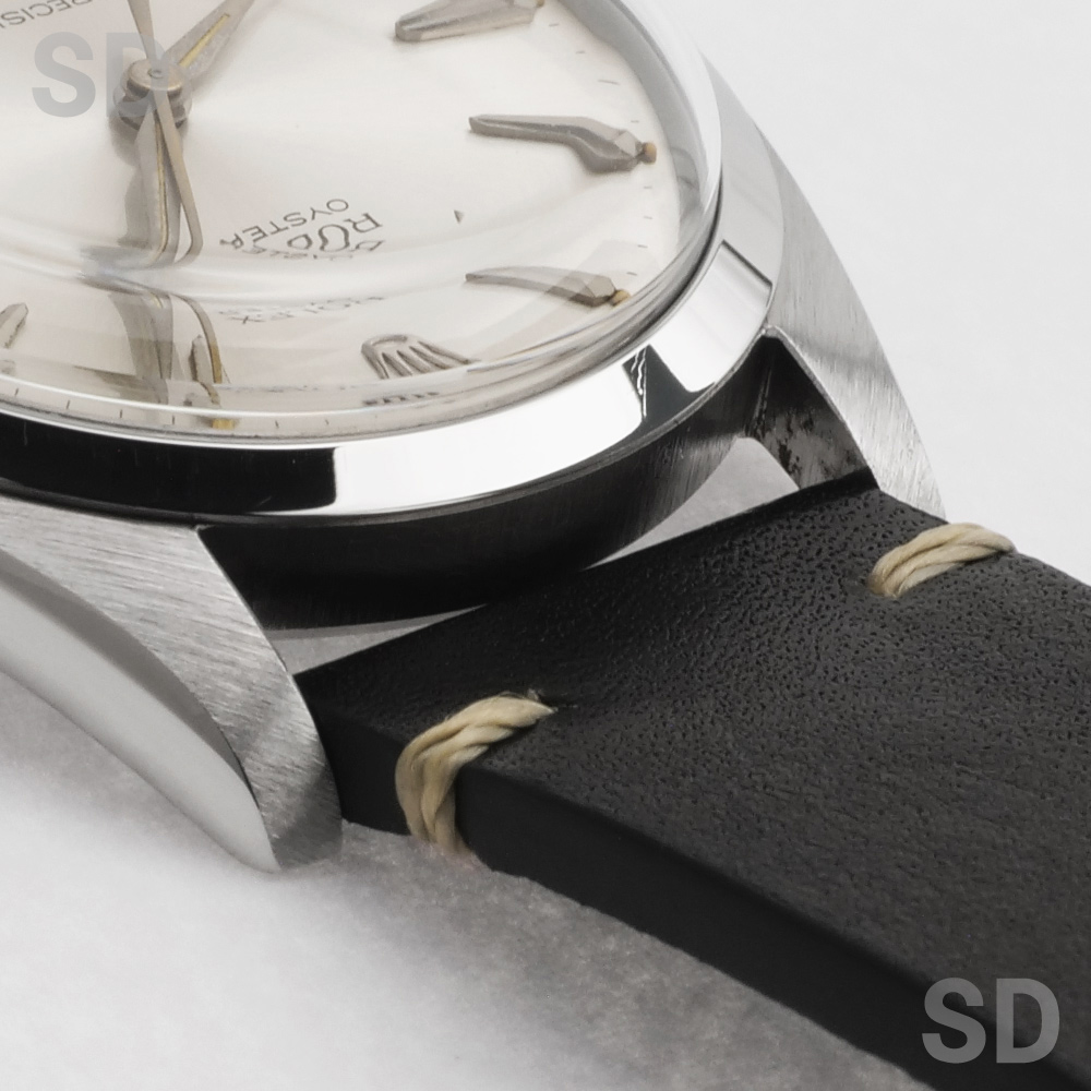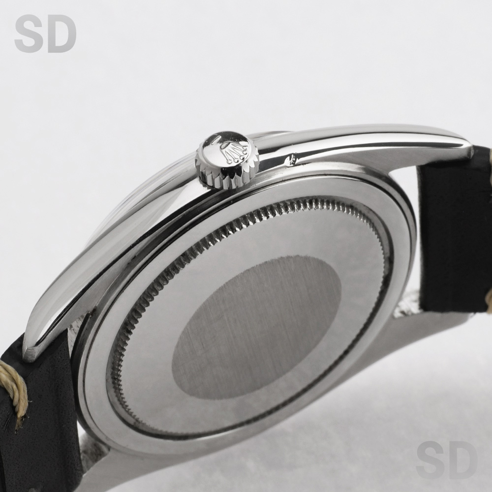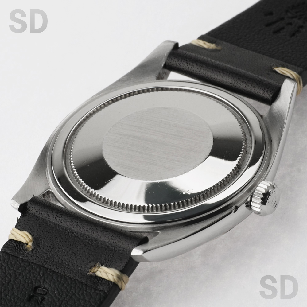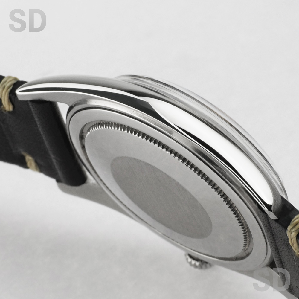 1960年代当時のオイスターシリーズは34mmケースが一般的であり、一回り大きな36mmケースをもつこのモデルは通称「ビッグオイスター」と呼ばれるようになりました。その大きなサイズのみならず、ビッグオイスターにはケースサイドの横穴がないのも特徴で、通常オイスターケースであれば90年代初期までは、どのモデルにも共通してあるはずのケースにブレスレットを固定するバネ棒穴が、このモデルには存在しないとても不思議なモデルとされています。