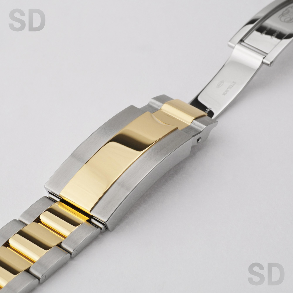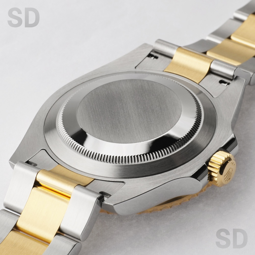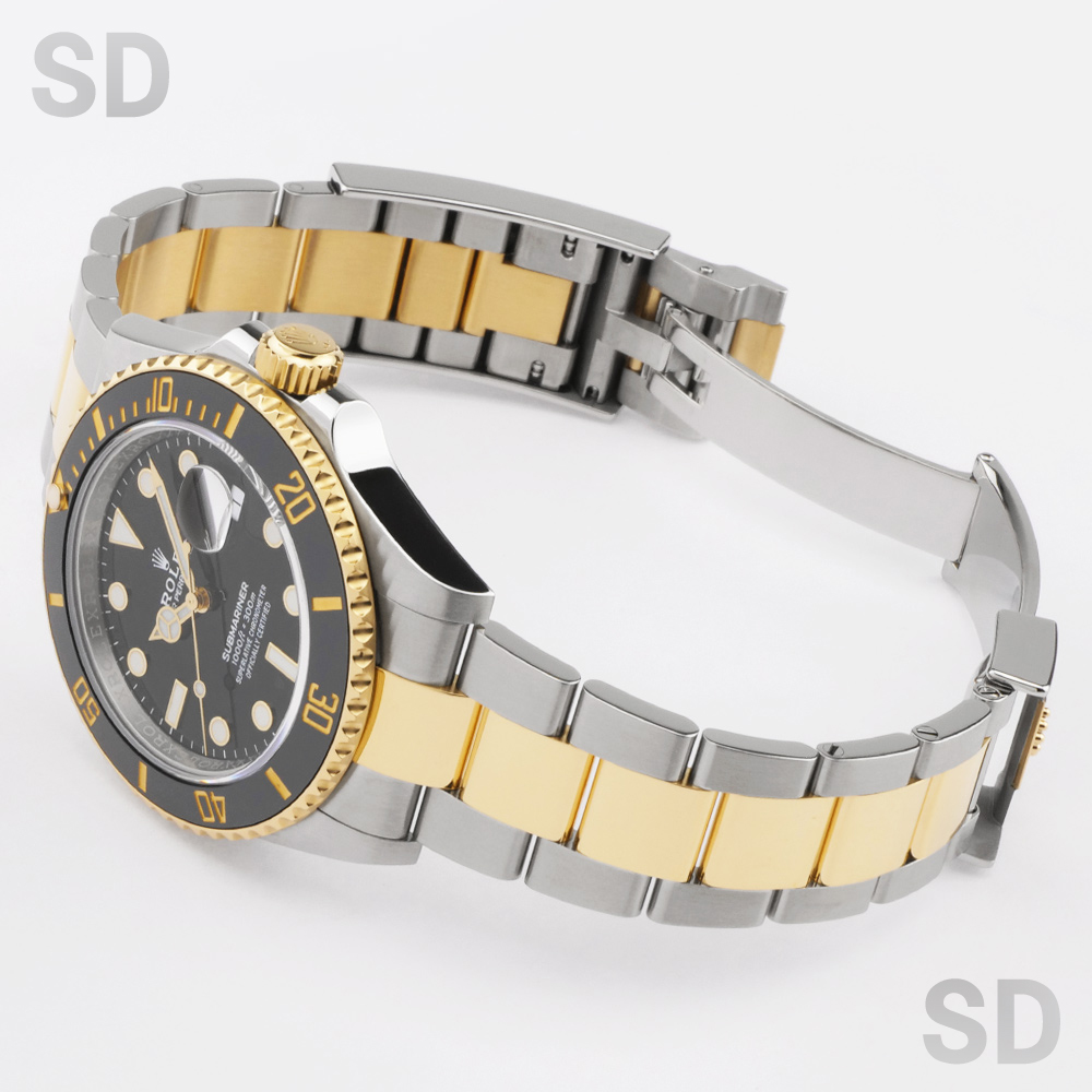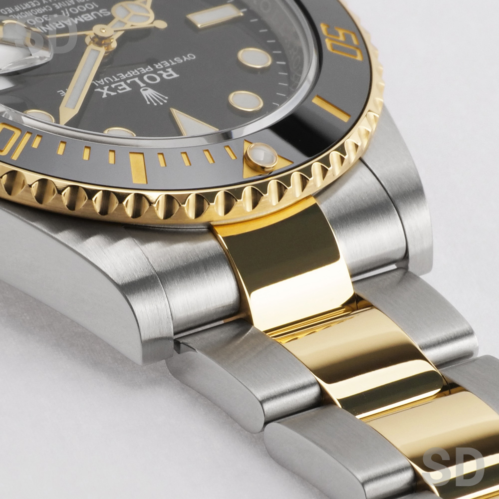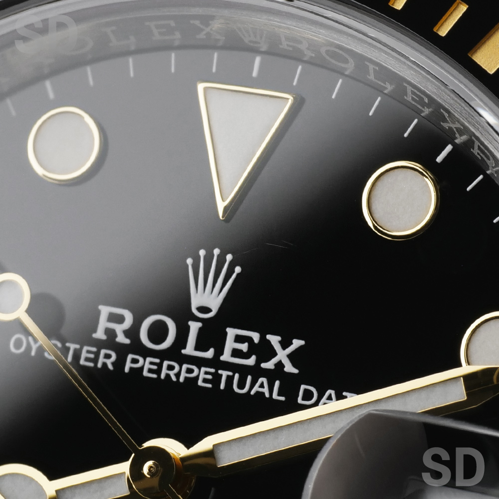 本モデルは、ステンレススチールとイエローゴールドを組み合わせたロレゾール(コンビ)仕様の、現行サブマリーナーです。深みのあるブラックダイアルとセラクロムベゼルに、イエローゴールドの艶やかな輝きが調和し、洗練された美しさを際立たせます。ケースサイズは従来の40mmから41mmへと進化し、よりバランスの取れたプロポーションを実現。内部には最新世代の自動巻きムーブメントCal.3235を搭載し、高精度と約70時間のパワーリザーブを誇るなど、実用性においても大きく向上しております。