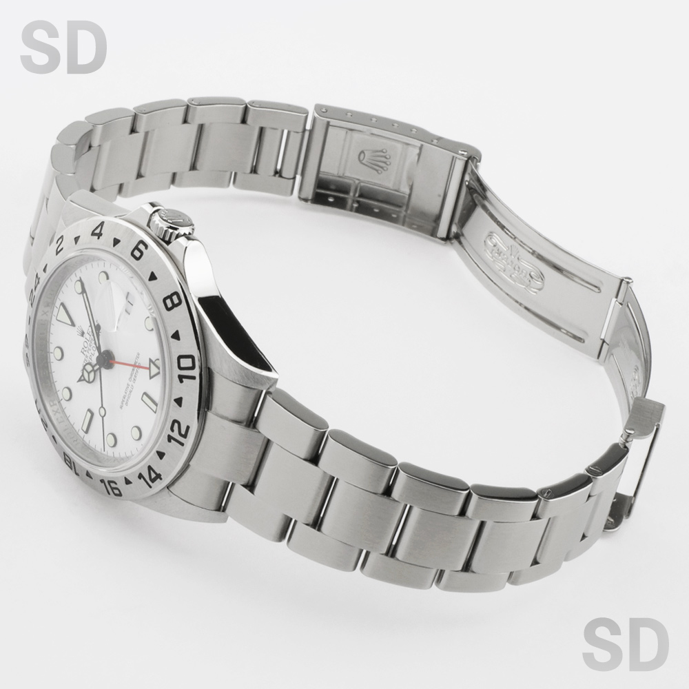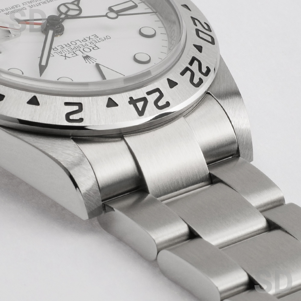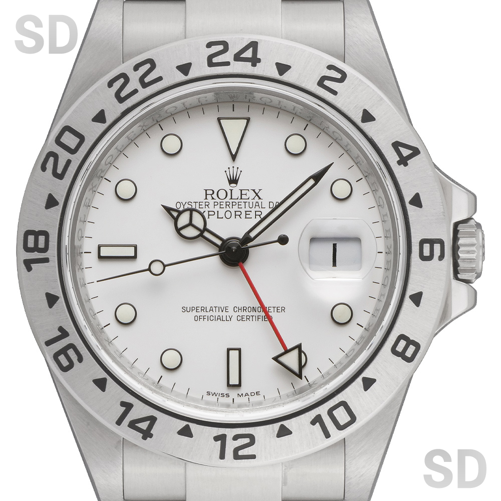エクスプローラー2としては3代目となるこちらのモデル。おおよそ1988年から2011年までの長期的な製造でコレクションのデザインを確立しました。エクスプローラー2としては最後の40mmケースとなり、後継機モデルがサイズアップしてしまったことで現在でも根強くファンがおります。使い勝手の良いサイズ感とツールウォッチとしての視認性の良さはスポーツモデルの中でも秀でており、オフホワイトの文字盤がとても爽やかで清楚感溢れる1本です。