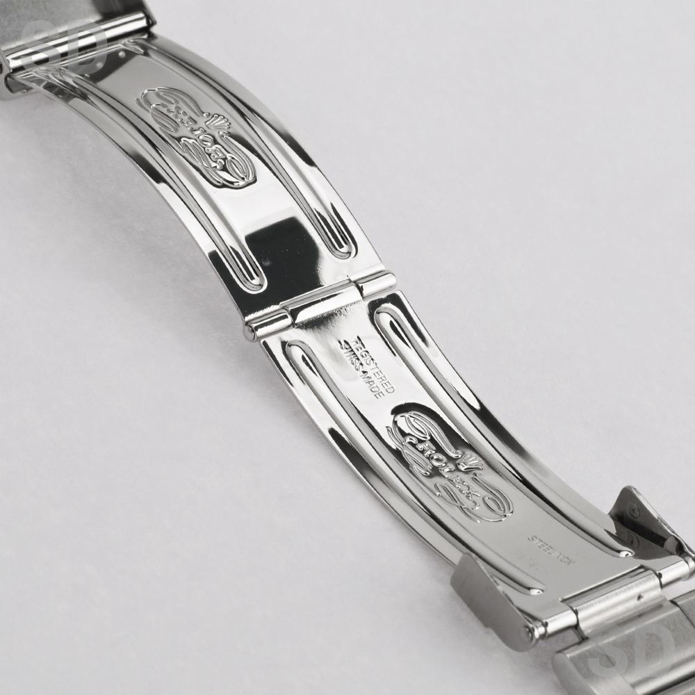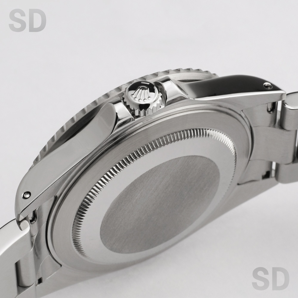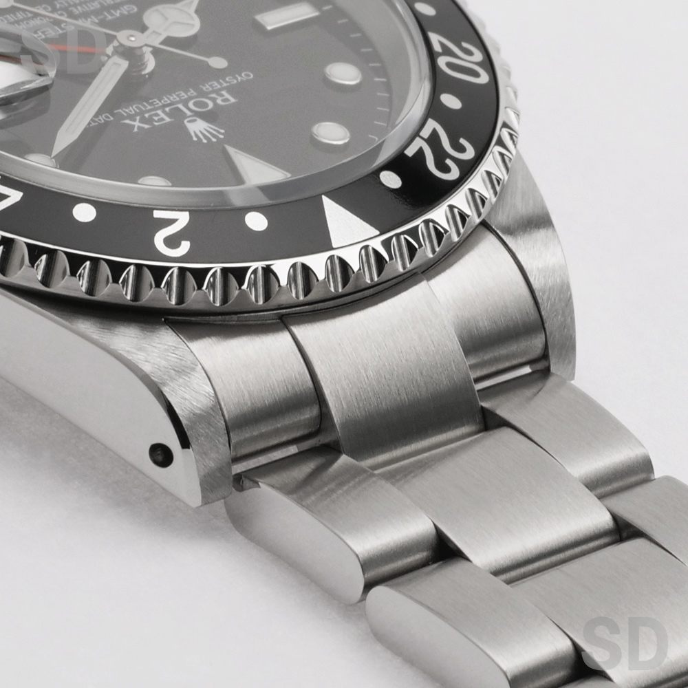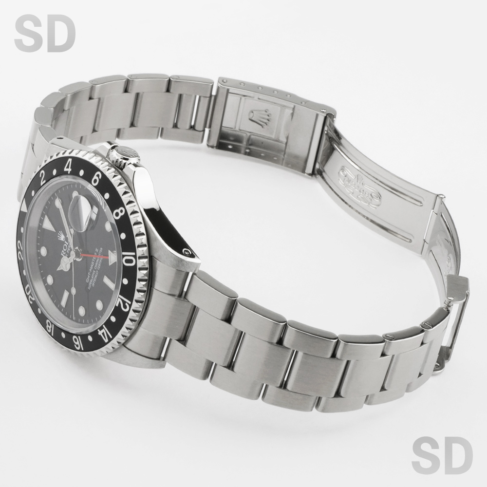 本個体は1989年頃から2007年頃にかけて製造されていた旧型リファレンスにあたり、アルミニウム製ベゼルを採用した世代の終盤を代表する存在です。ブラック単色の両方向回転ベゼルとGMT針の組み合わせにより最大3カ国の時間帯を同時に把握することが可能で、ローカル時針の独立調整機能を世界で初めて実用化したトラベルウォッチとして高い評価を受けています。ケース径は40mmでありながら、ラグ形状や厚みのバランスにより現行モデルと比較して装着感が軽快で、日常使いしやすい点も大きな特徴です。
