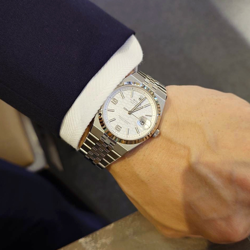 2014年にリニューアルされ、自動巻きとなったチェリーニコレクションの一つであるチェリーニタイム。12時、3時、6時、9時には大きくプリントされたローマ数字がスタイリッシュで他のインデックスの邪魔をすることもなく美しくバランスの取れたデザインへと仕上がりました。しかし、2016年にはすべてバーインデックスへとマイナーチェンジしていることもあり、この文字盤は初期仕様で比較的個体数は少なめであると感じます。とてもシックでありながらも清楚で優しい印象を与えます。ビジネススタイルにも活躍できる1本です。