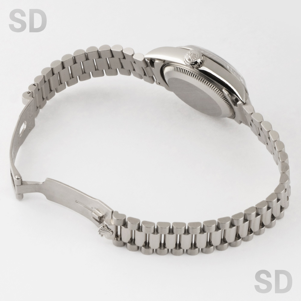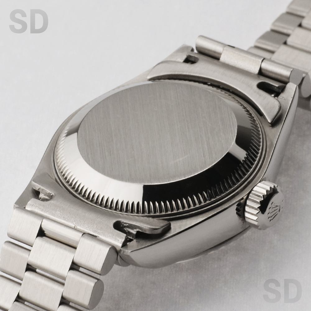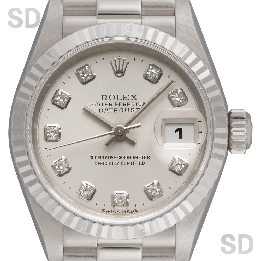 本個体は1983年頃から1997年頃にかけて製造されていた旧型リファレンスにあたり、ロレックスのドレスウォッチを象徴するデイトジャストの中でも、洗練された気品を放つ26mmサイズのレディースモデルでございます。ホワイトゴールド無垢を採用したケースに、繊細な陰影を生むフルーテッドベゼルが組み合わされ、金無垢モデル専用のプレジデントブレスレットが上質な着用感を実現しております。加えて、定番のシルバーダイアルを配することで、統一感のある上品な輝きと高い視認性を両立し、素材本来の美しさを引き立てた完成度の高い仕上がりとなっております。
