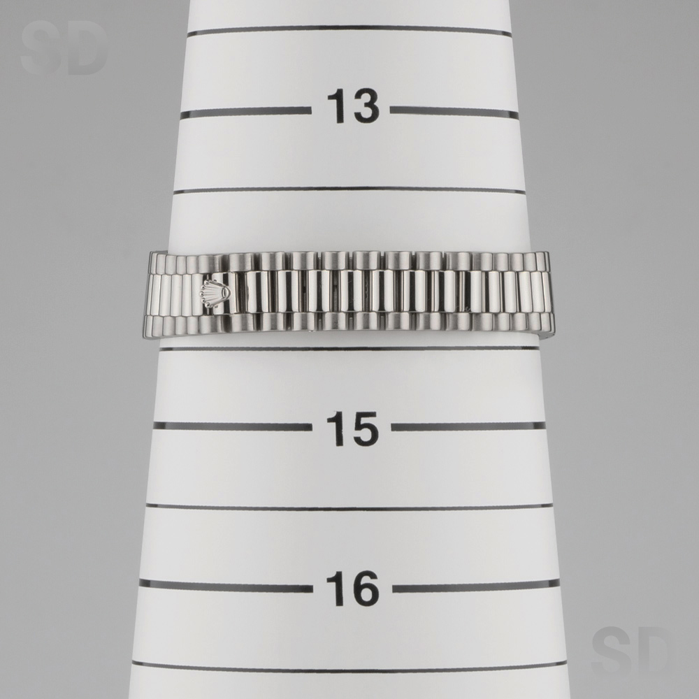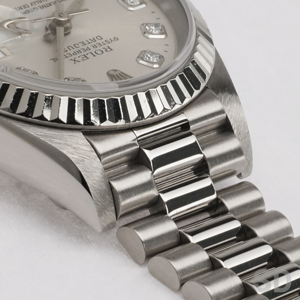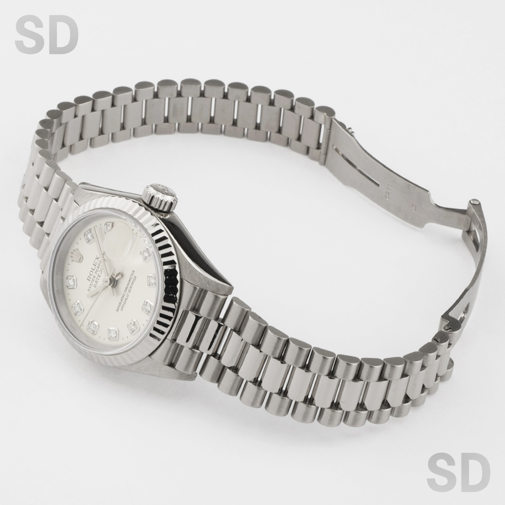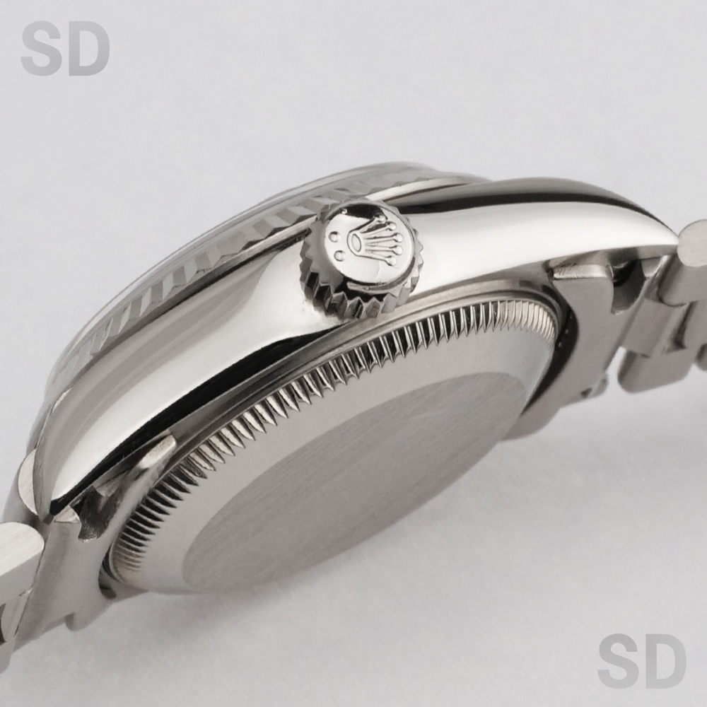 本個体は1983年頃から1997年頃にかけて製造されていた旧型リファレンスにあたり、ロレックスのドレスウォッチを象徴するデイトジャストの中でも、洗練された気品を放つ26mmサイズのレディースモデルでございます。ホワイトゴールド無垢を採用したケースに、繊細な陰影を生むフルーテッドベゼルが組み合わされ、金無垢モデル専用のプレジデントブレスレットが上質な着用感を実現しております。加えて、定番のシルバーダイアルを配することで、統一感のある上品な輝きと高い視認性を両立し、素材本来の美しさを引き立てた完成度の高い仕上がりとなっております。