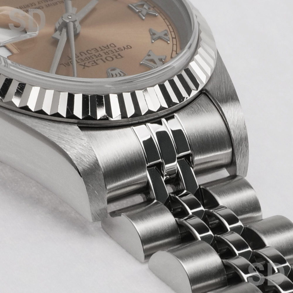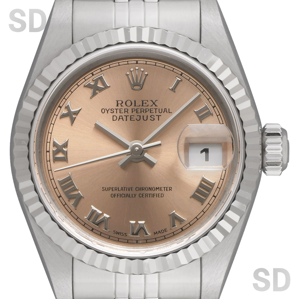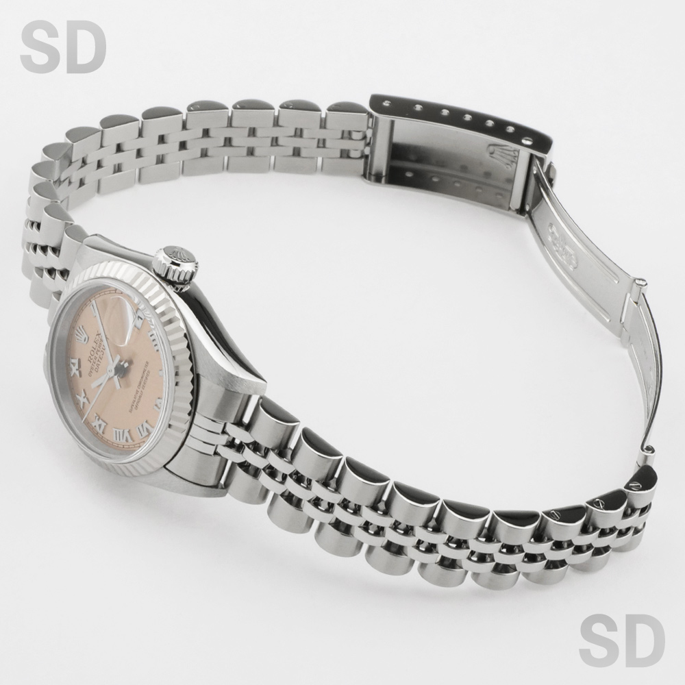 本個体は1999年頃から2003年頃にかけて製造されていた旧型リファレンスにあたり、ロレックスのドレスウォッチを象徴するデイトジャストの中でも、洗練された気品を放つ26mmサイズのレディースモデルでございます。ホワイトゴールド製のフルーテッドベゼルとステンレススチールによるロレゾール(コンビ)仕様に、中空構造のコマにより軽量性としなやかな装着感を両立したジュビリーブレスレットが装着。サテン仕上げが施された外装により、後継モデルと比べて落ち着いた佇まいを感じさせる点も魅力です。ピンクローマダイアルを配することで、柔らかな色調が全体に上品な華やかさを添え、ローマンインデックスのクラシカルな意匠と相まって、女性らしさと気品を兼ね備えた優雅な表情を演出しております。