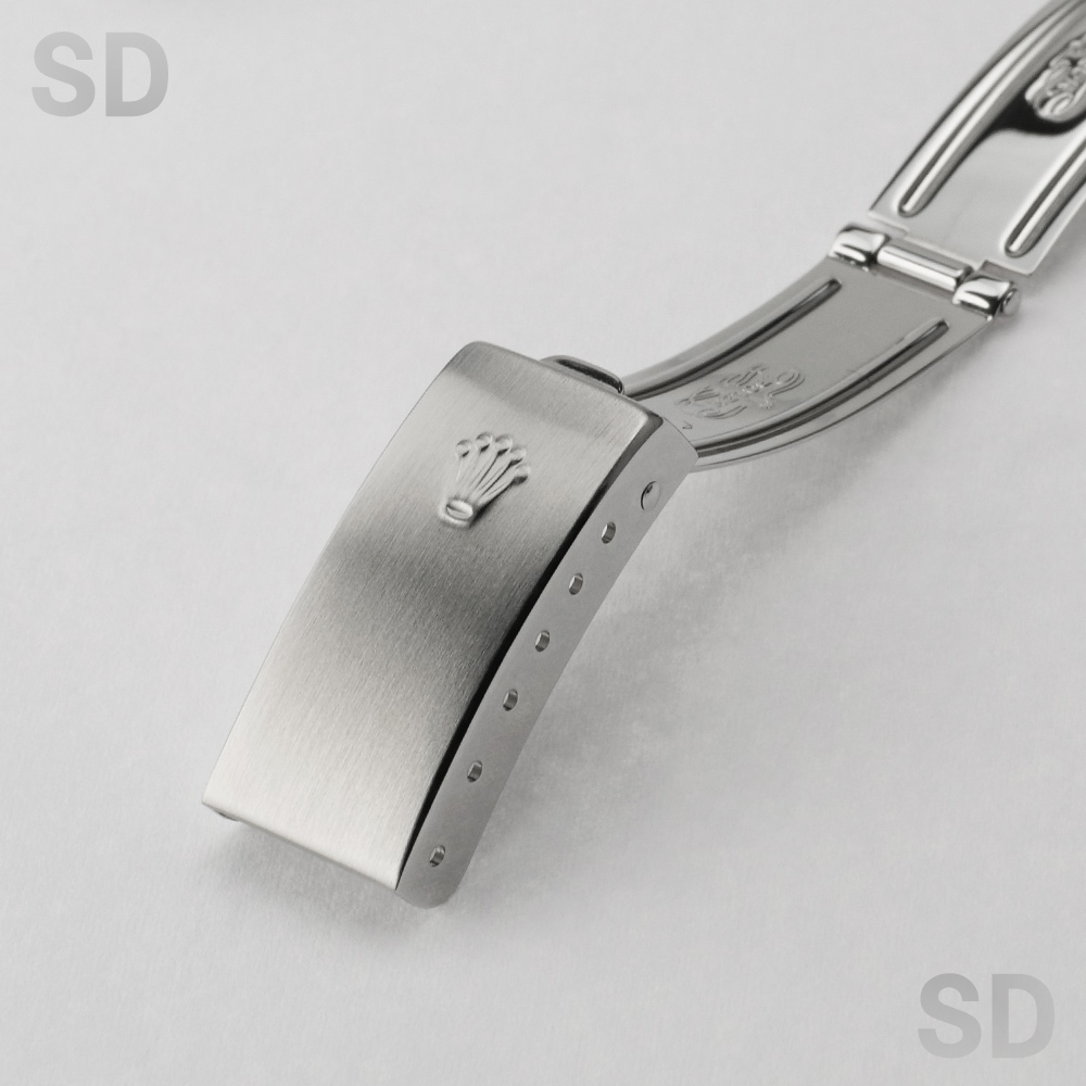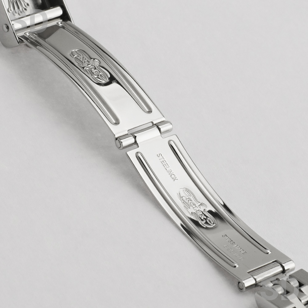 その他の外装につきましては、提携の修理工房にてポリッシング(研磨)が施されており、ケースサイドやフラッシュフィット裏側に小傷が残存する程度で、外観を著しく損なうような深い傷や打痕などの顕著なダメージは認められておりません。また、ブレスレットの伸びも最小限に留まっており、製造年代を踏まえますと非常に良好な保存状態を維持している個体といえます。
