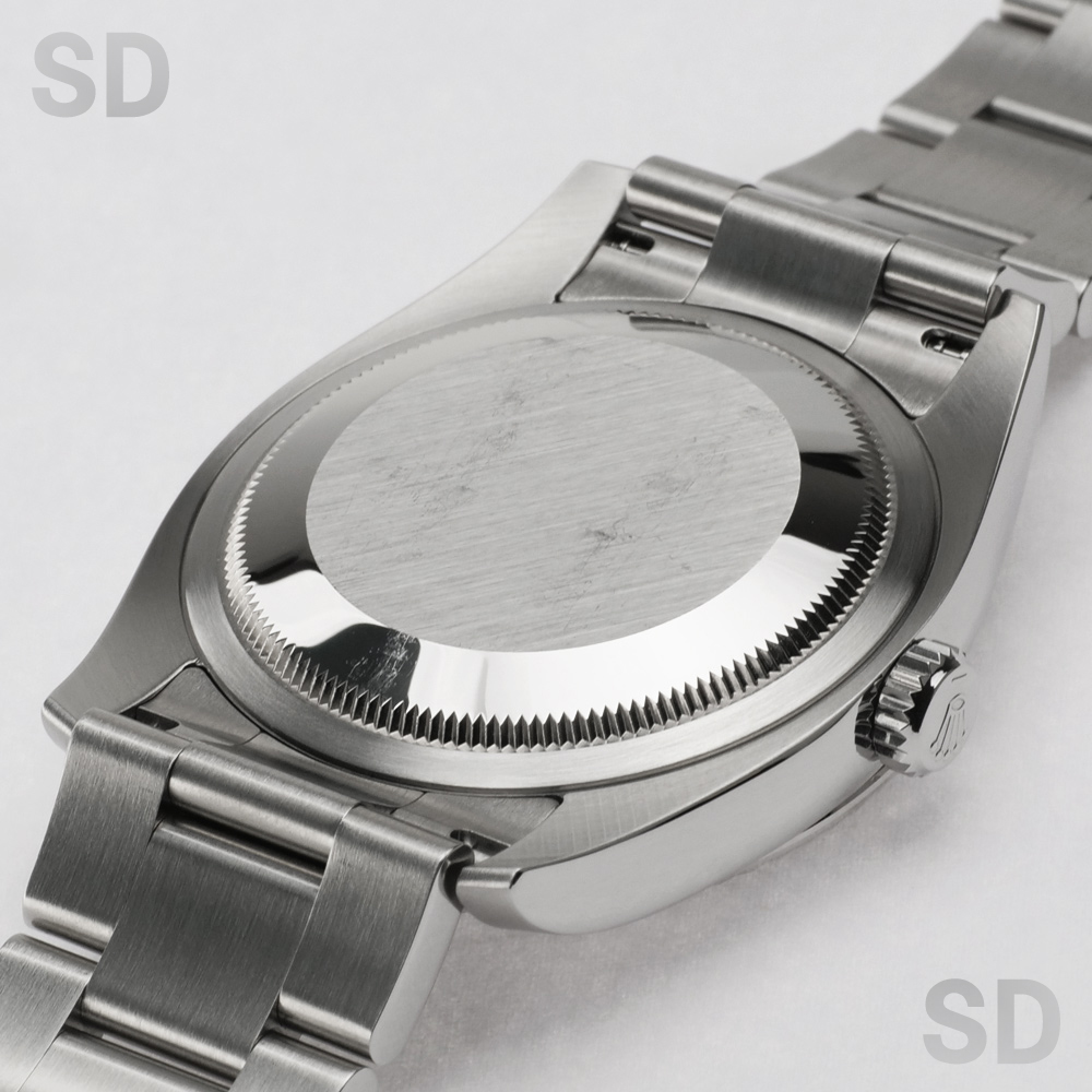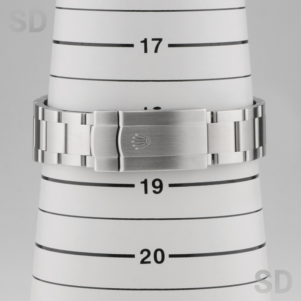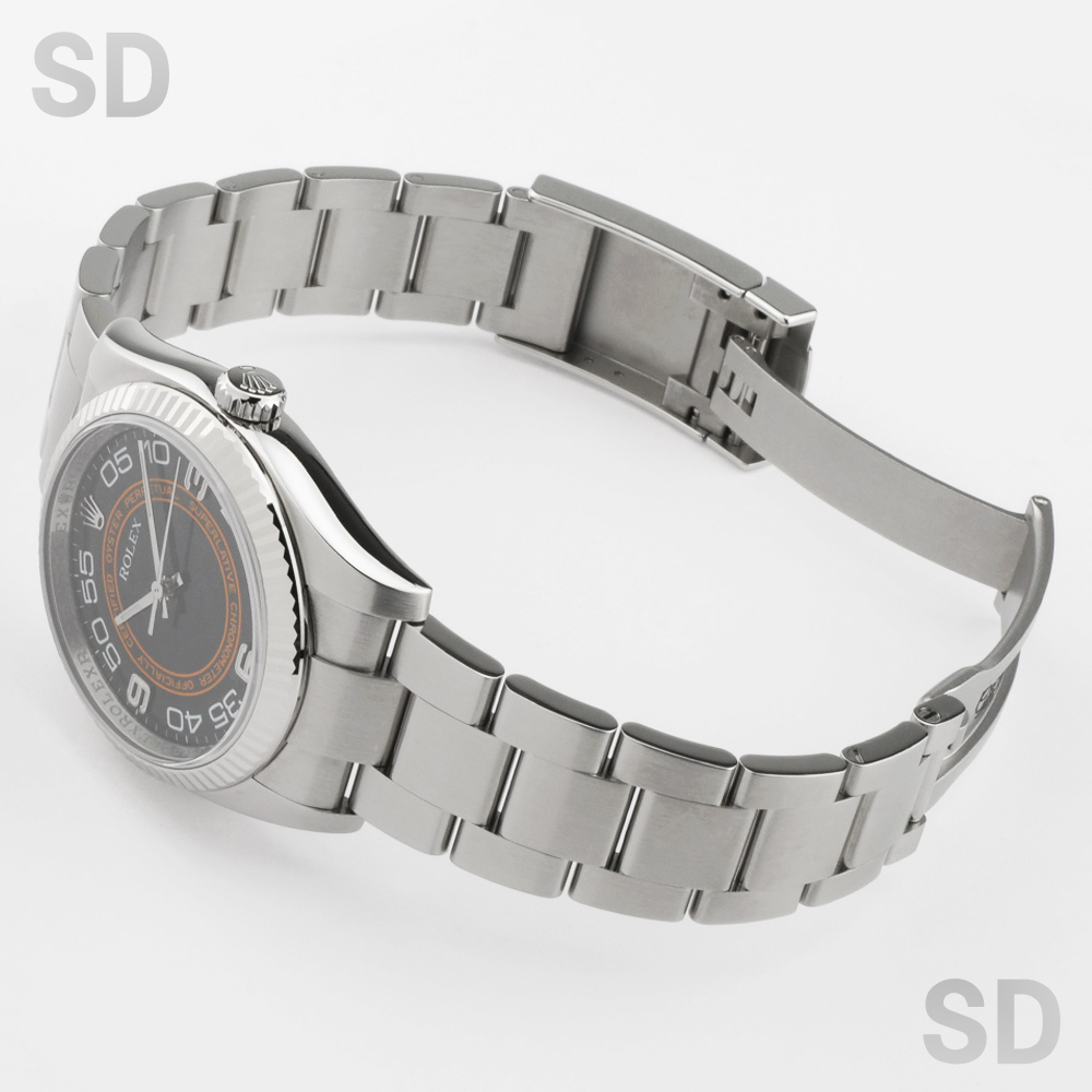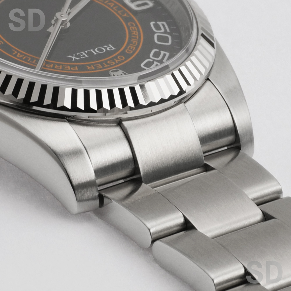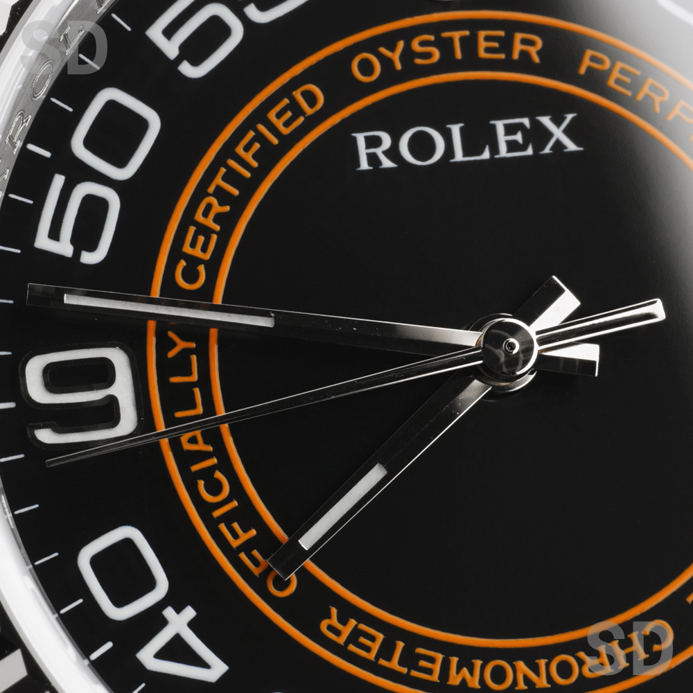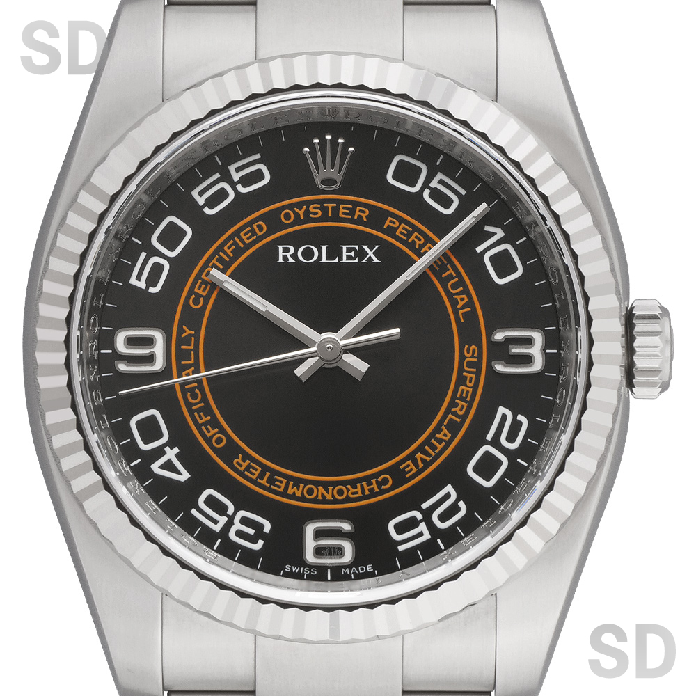 本個体は2008年頃から2012年頃にかけて製造されていた旧型リファレンスにあたり、ホワイトゴールド製のフルーテッドベゼルとステンレススチールを組み合わせてロレゾール(コンビ)仕様のモデルでございます。後継機が存在しない点に加え、当時のオールステンレス仕様と比較して生産期間が極めて短かったことから、市場においても認知度・流通量ともに限られた希少な存在といえます。堅牢性に優れるオイスターケースと、安定した精度を誇る自動巻きムーブメントCal.3130を備え、ダイアルにはブラックを基調とし、オレンジカラーのサークルおよびレターがアクセントとして施され、ホワイトのアラビアインデックスと相まって高い視認性と個性的な表情を演出。スポーティさとデザイン性を兼ね備えた、極めて希少性の高い仕様となっております。
