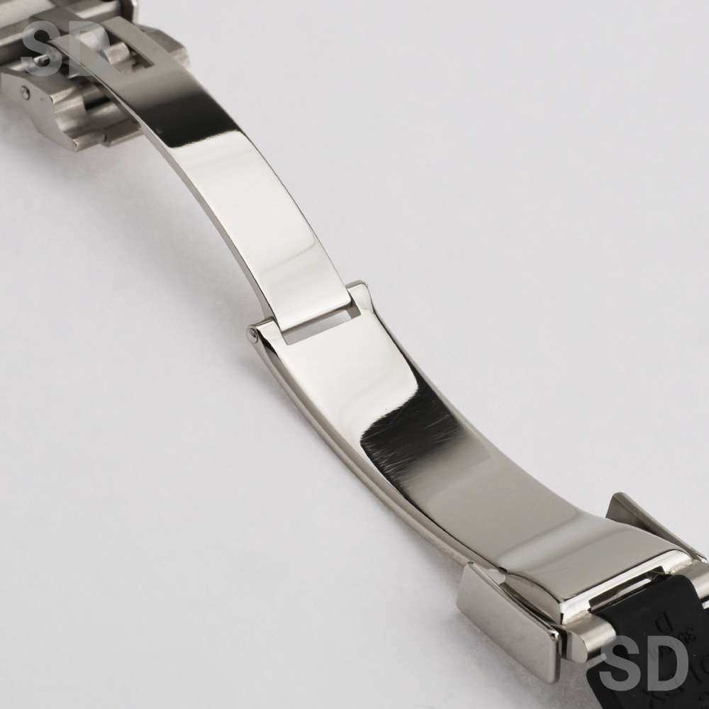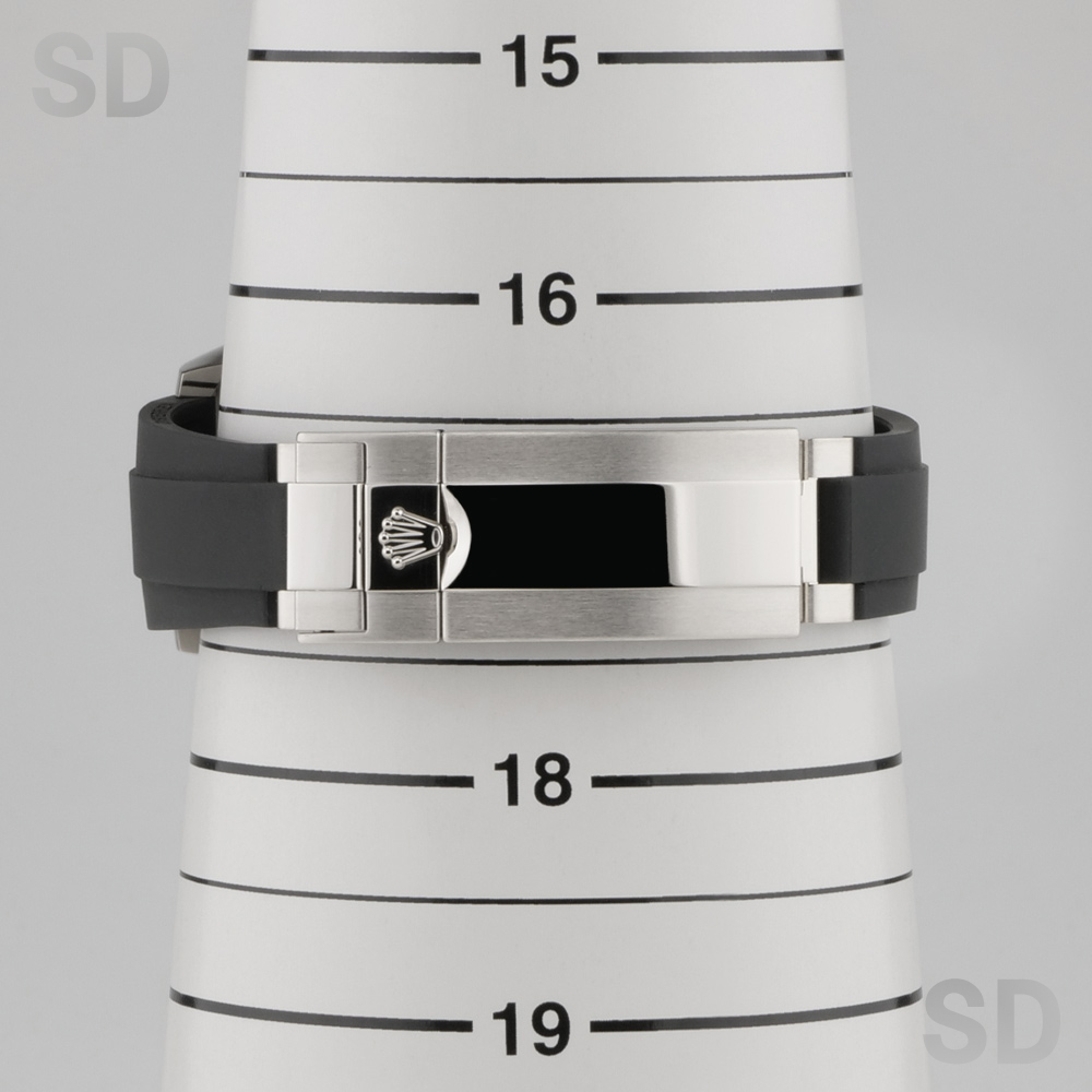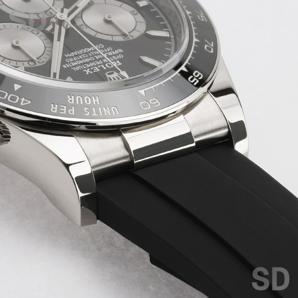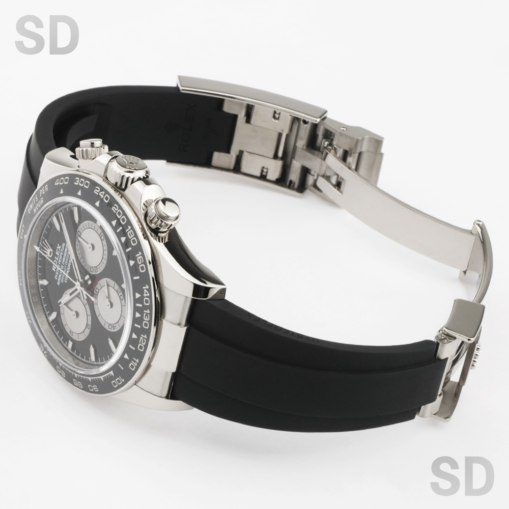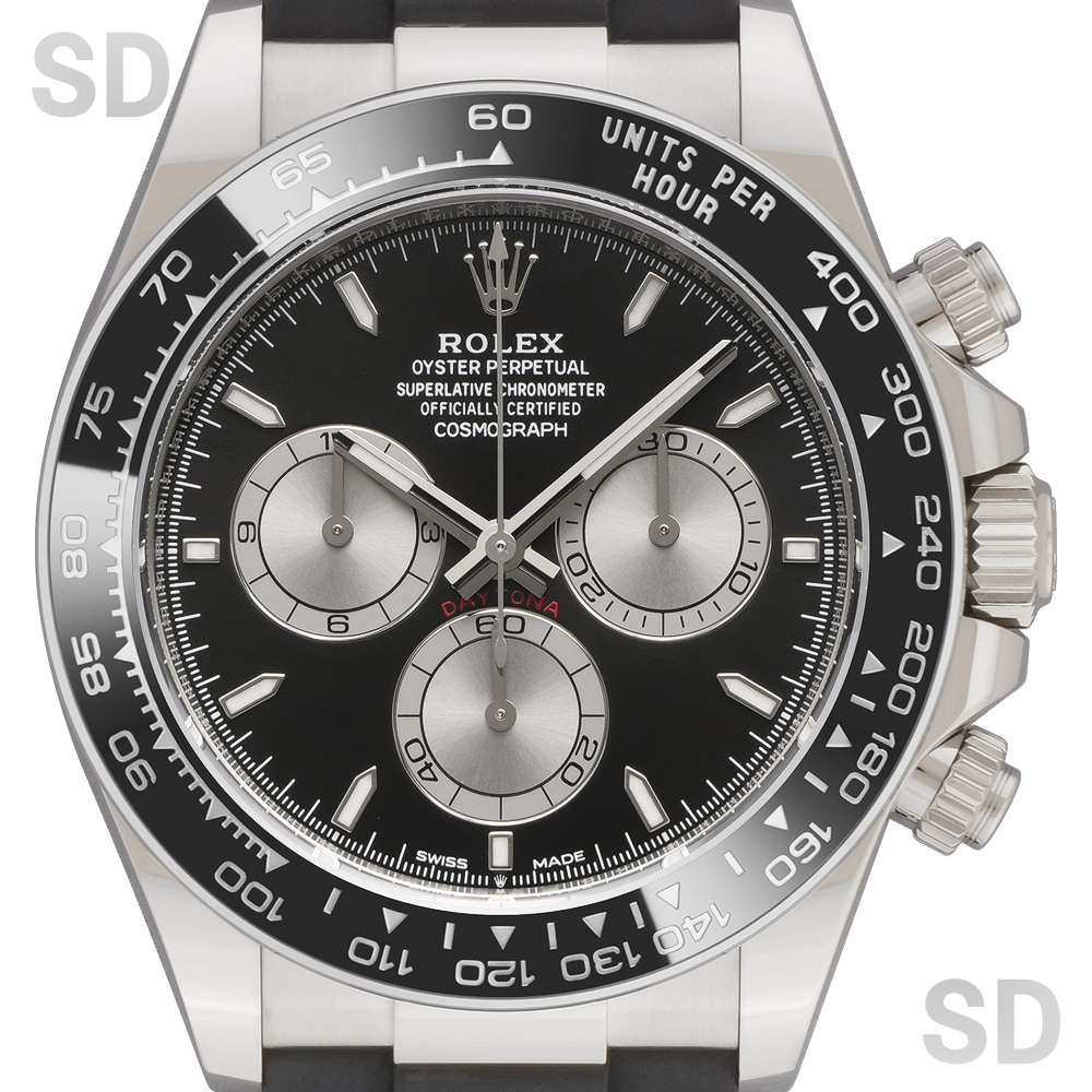 本個体は、18kホワイトゴールドケースにブラックセラクロムベゼルを組み合わせ、オイスターフレックスブレスレットを備えた現行モデルのコスモグラフデイトナでございます。ムーブメントには新世代キャリバーCal.4131を搭載し、約72時間のパワーリザーブを確保。ブレスレットには5mmの延長が可能なロレックスグライドロックエクステンションシステムが搭載されており、快適な装着感を実現しております。ダイアルはブラックベースにスチールのインダイアルを備えた、新型モデルより採用されたデザインです。