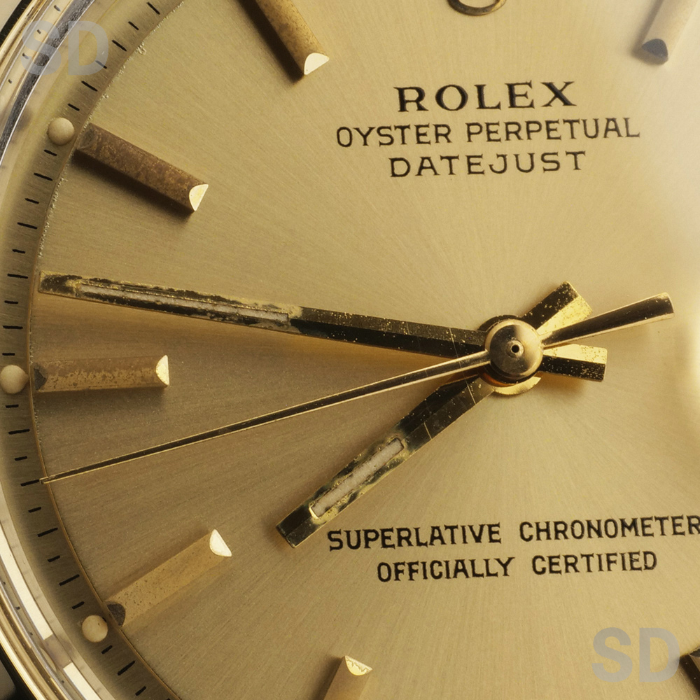 文字盤表面は綺麗ですが、文字盤段落ち部分(主に45分から55分付近にかけて)に一部劣化が見受けられます。また、インデックスにくすみがございますが、これらはどれも非常に微細なもので、ルーペを使用して初めて確認できる程度です。