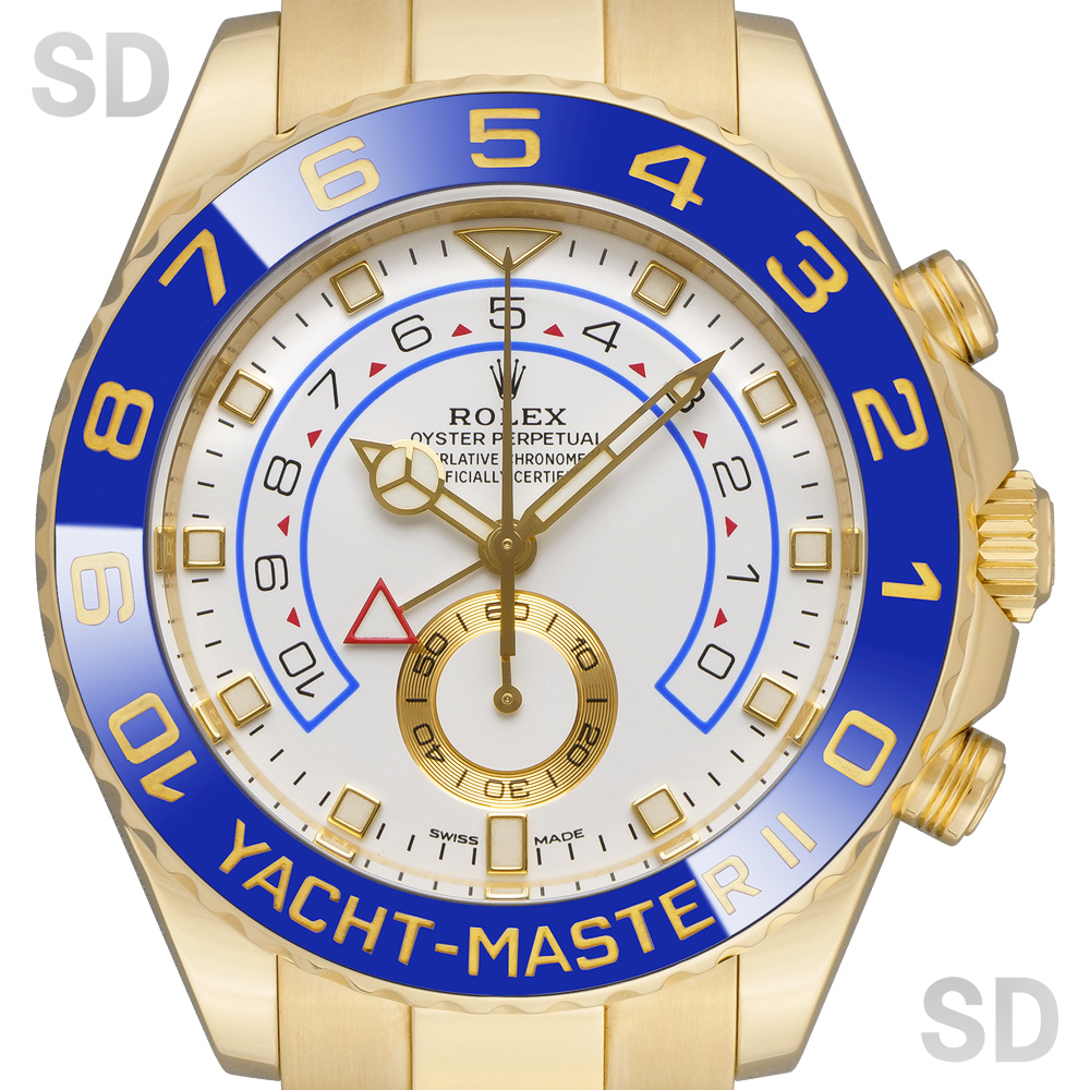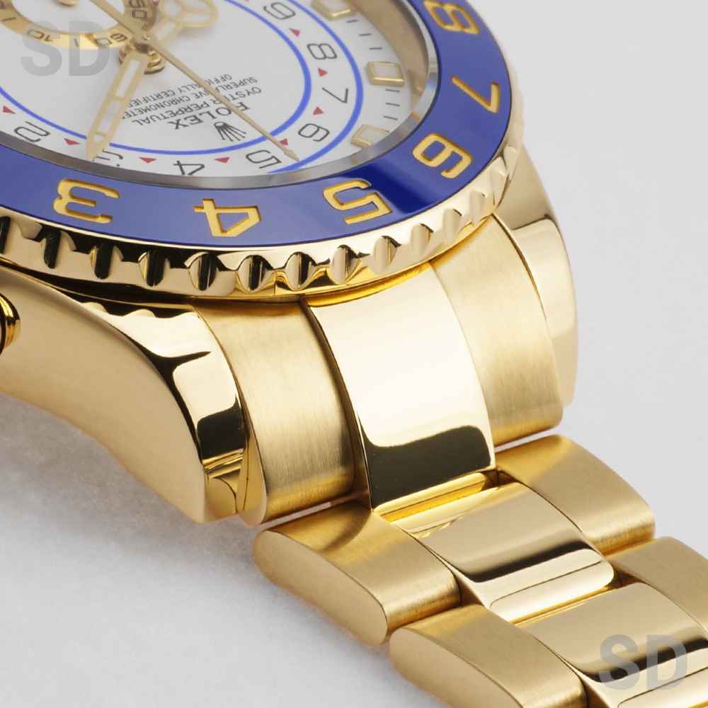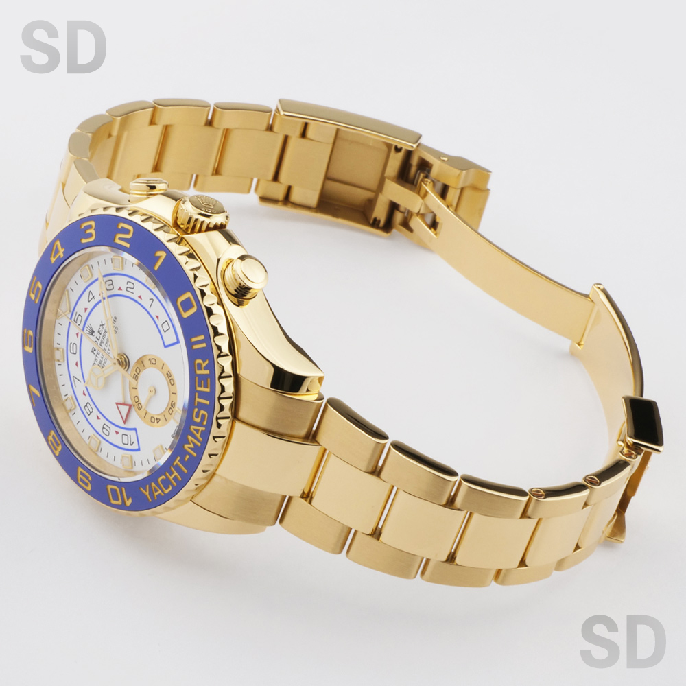 本個体は2007年から2024年頃まで製造されていた旧型リファレンスにあたり、ロレックスとして初となる機械式レガッタ機能を搭載し、10分から1分までのカウントダウン設定が可能となり、特許取得の専用ムーブメントと連動するリングコマンドベゼルによって、複雑な機構でありながら直感的な操作性を実現しております。また、ヨットマスターシリーズにおいて、18Kイエローゴールドモデルとして初めてブルーカラーのベゼルを採用しており、後期型のベンツ針との組み合わせによって、視認性とデザイン性を高い次元で両立しております。