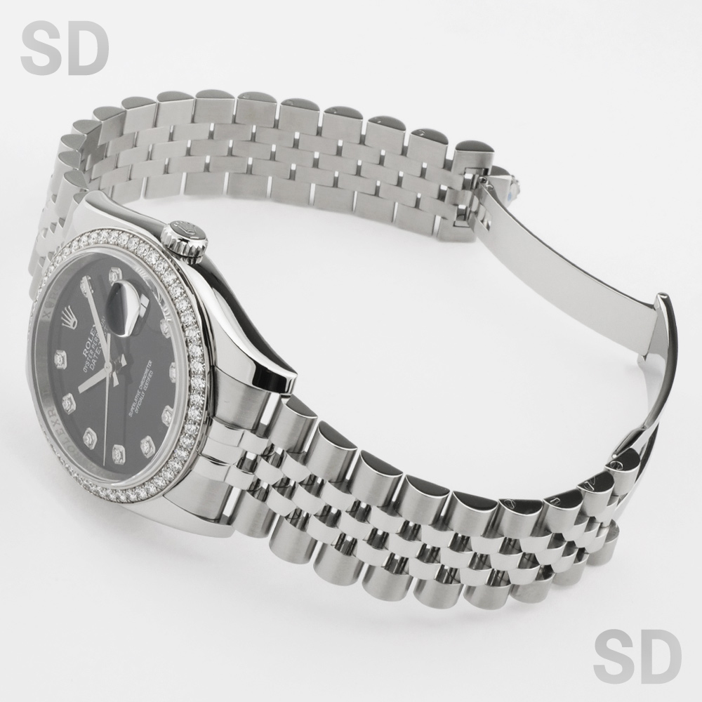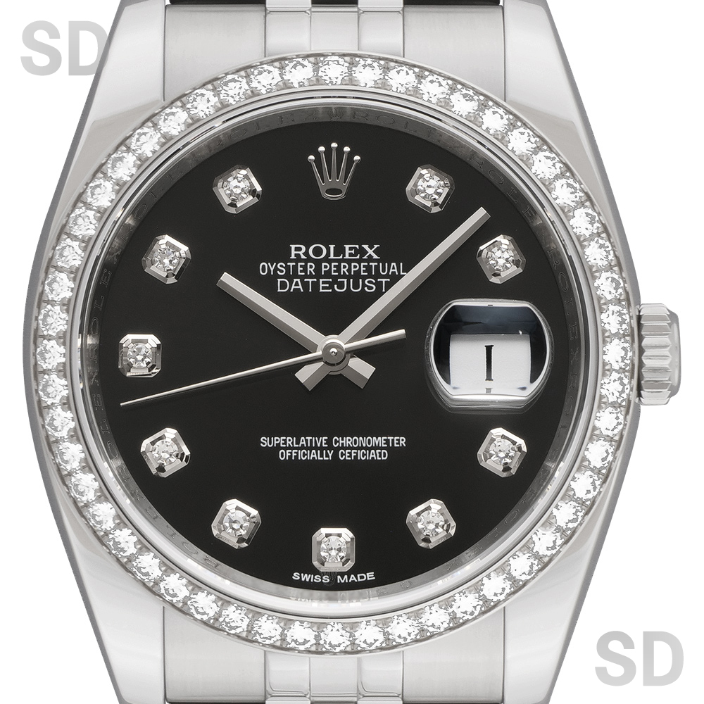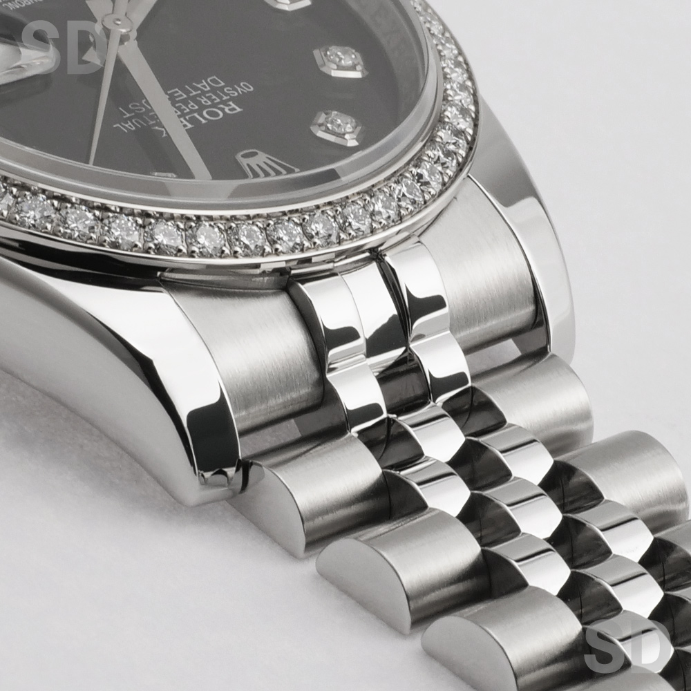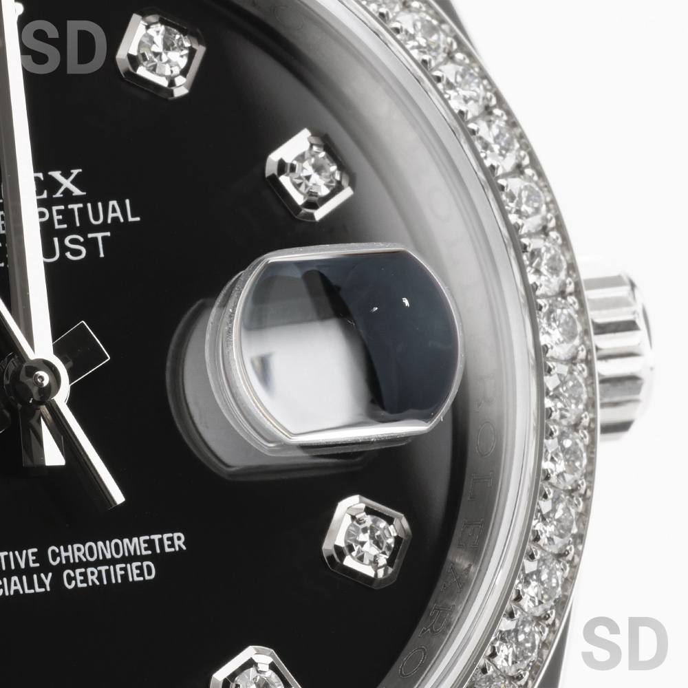 本個体は2009年から2019年頃まで製造されていた旧型リファレンスにあたり、36mmケースにホワイトゴールド製のダイヤモンド入りベゼルとステンレススチールを組み合わせたロレゾール(コンビ)仕様のモデルでございます。ベゼルには一周にわたり計52石のダイヤモンドがセッティングされ、外観からバックルが目立たないコンシールドクラスプ付きジュビリーブレスレットが装着されております。文字盤はブラックを基調とし、インデックスにもダイヤモンドを配することで、ベゼルの輝きと相まって一層の華やかさと統一感を演出した、ラグジュアリーな仕上がりとなっております。