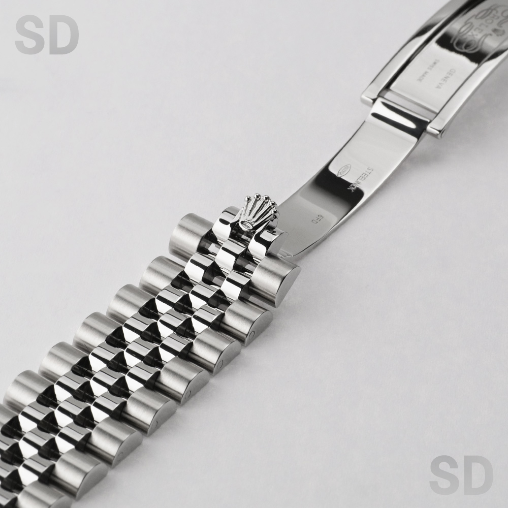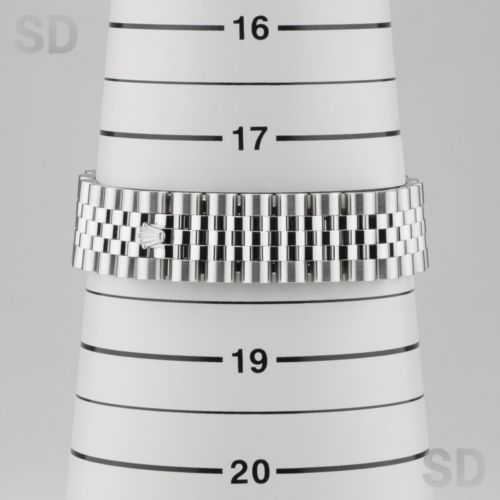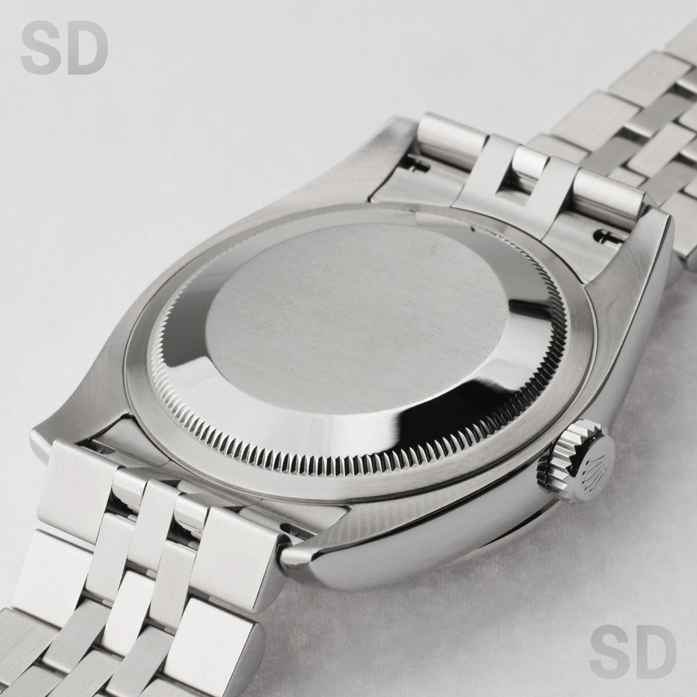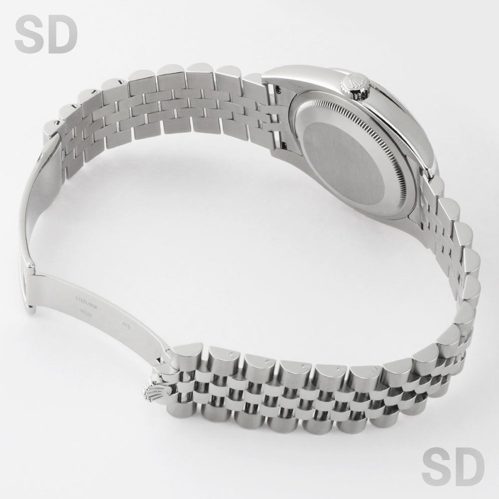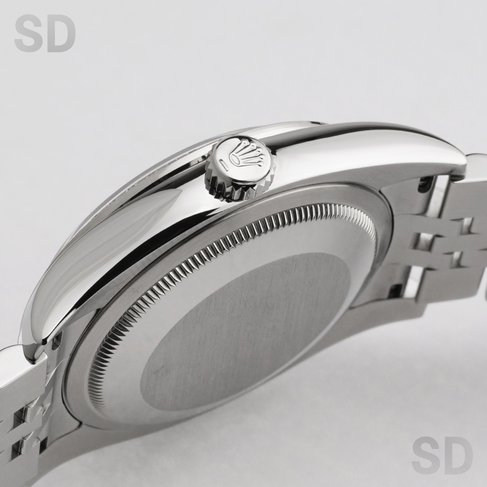 本個体は2009年から2019年頃まで製造されていた旧型リファレンスにあたり、36mmケースにホワイトゴールド製のダイヤモンド入りベゼルとステンレススチールを組み合わせたロレゾール(コンビ)仕様のモデルでございます。ベゼルには一周にわたり計52石のダイヤモンドがセッティングされ、外観からバックルが目立たないコンシールドクラスプ付きジュビリーブレスレットが装着されております。文字盤はブラックを基調とし、インデックスにもダイヤモンドを配することで、ベゼルの輝きと相まって一層の華やかさと統一感を演出した、ラグジュアリーな仕上がりとなっております。