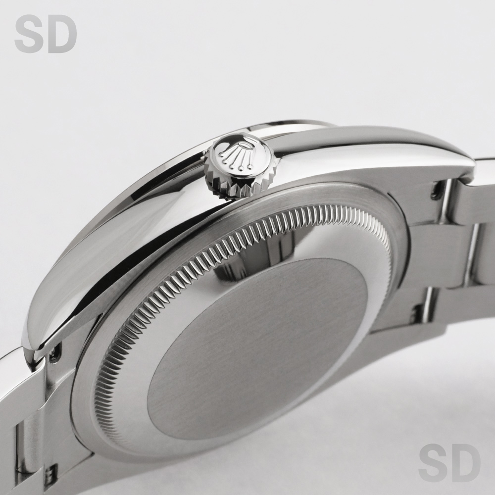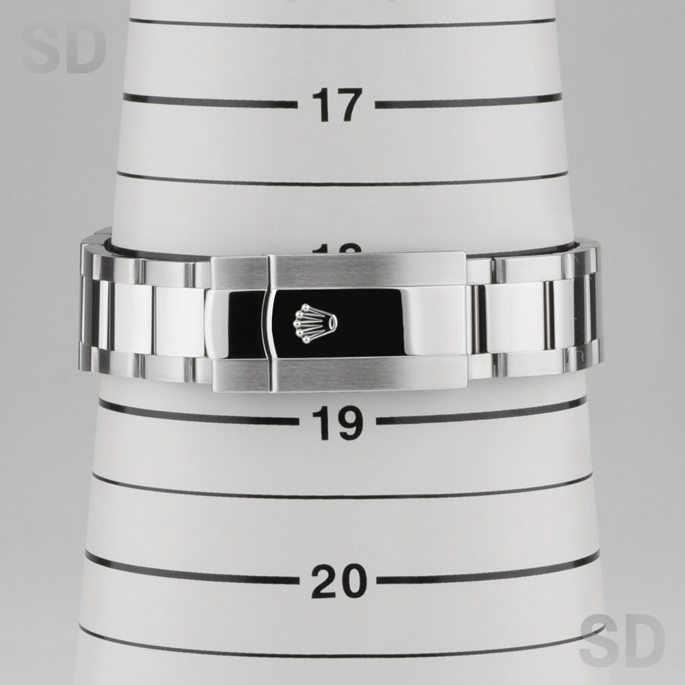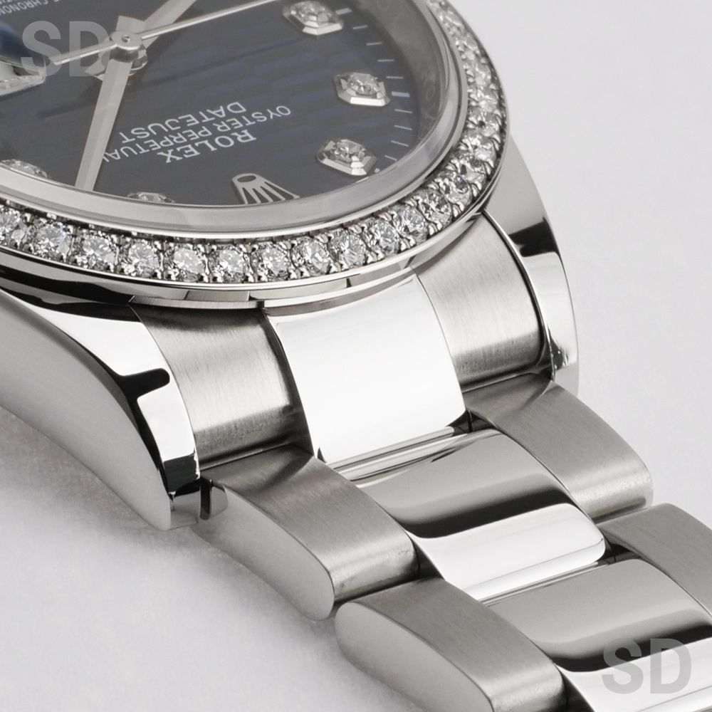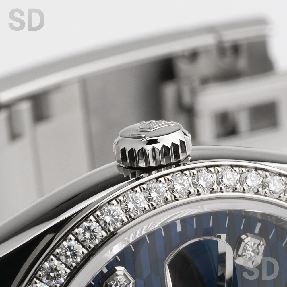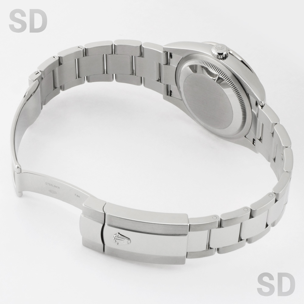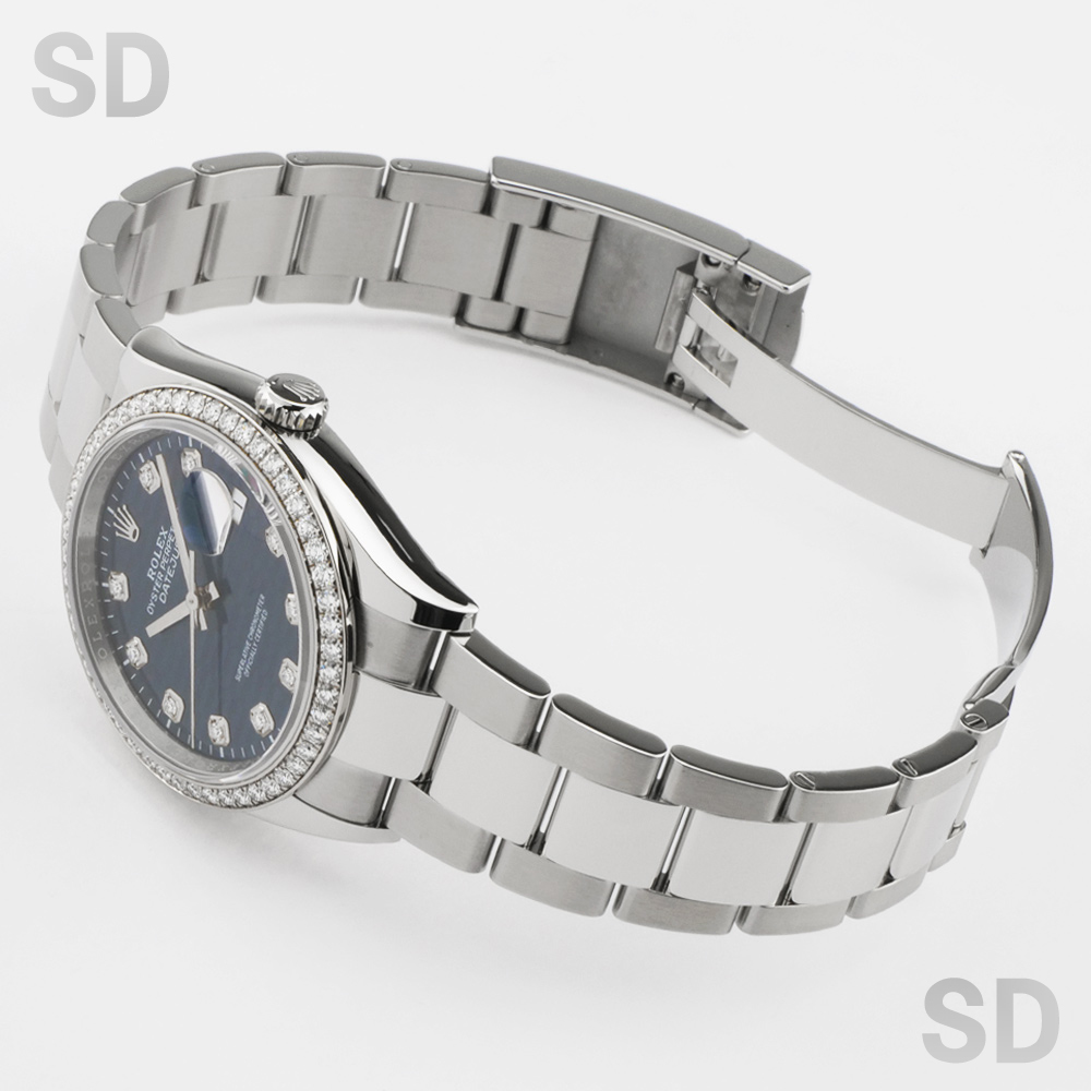 本個体は2018年より展開されている現行リファレンスにあたり、36mmケースにホワイトゴールド製のダイヤモンド入りベゼルとステンレススチールを組み合わせたロレゾール(コンビ)仕様のモデルでございます。ベゼルには一周にわたり計52石のダイヤモンドがセッティングされ、堅牢性に優れたオイスターブレスレットが装着されております。文字盤はわずか約3年間のみ生産された希少なフルーテッドモチーフを採用し、ダイヤモンドインデックスを配することで、立体感のある意匠と華やかな輝きを兼ね備えた存在感のある仕上がりとなっております。