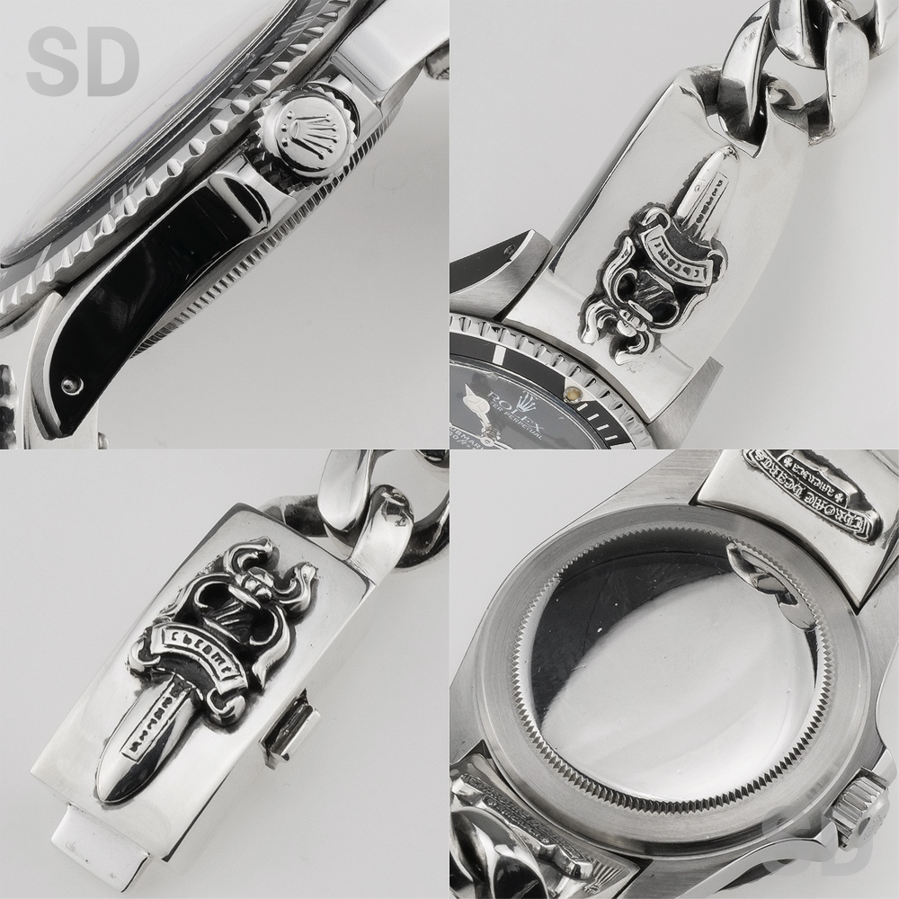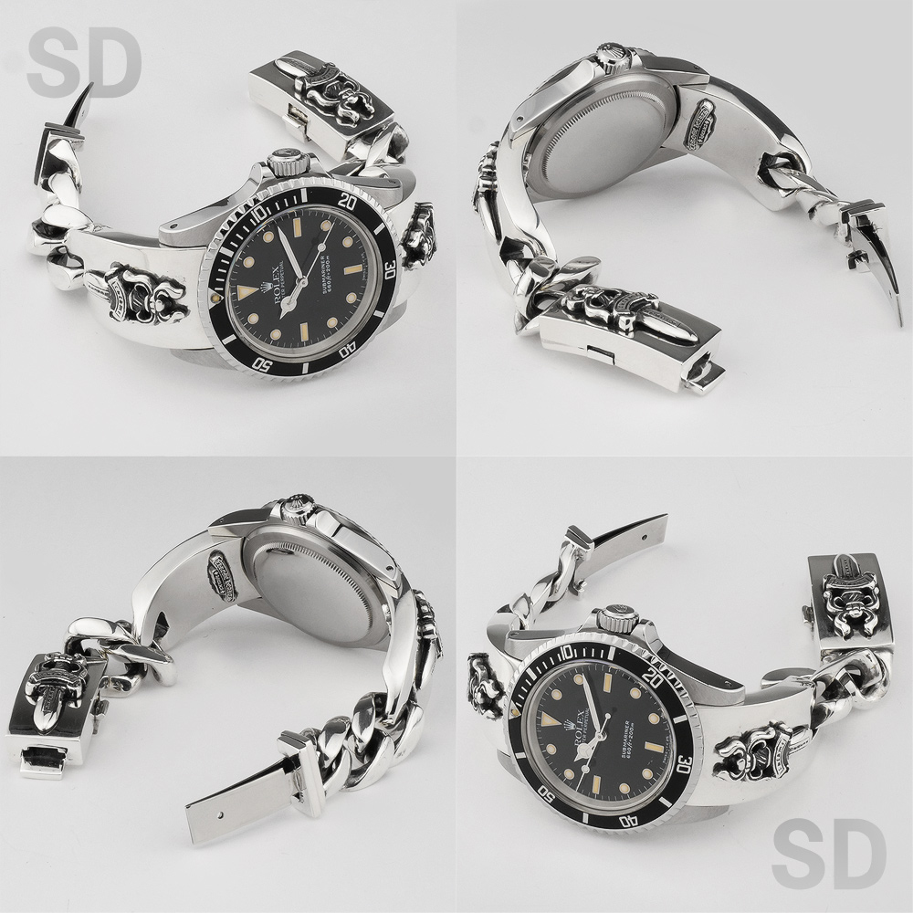 アンティーク サブマリーナーノンデイト 5513 が入荷いたしました。こちらの個体は後期型の「フチあり」ダイヤル、最終「L品番」のモデルです。さらにブレスレットにはダガーモチーフの「クロムハーツ」ブレスが装着されております。
