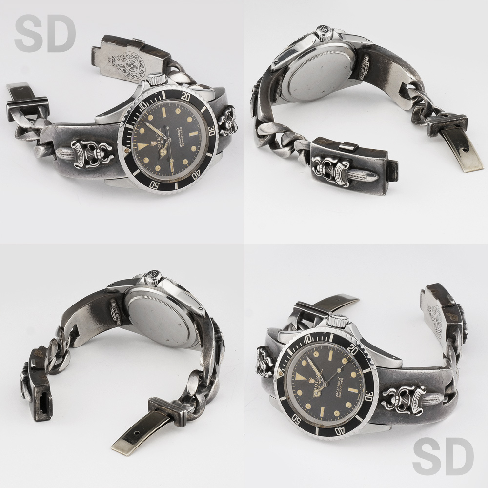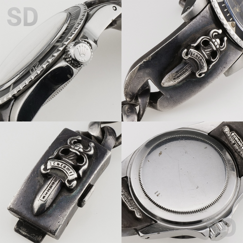 こちらの個体は独特の光沢を持つラッカー処理のような仕上げが施されているのが特徴の「ミラーダイヤル」が経年劣化によりブラウン化し、程よく枯れた雰囲気抜群の「ブラウンミラー」ダイヤルです。さらにブレスレットにはダガーモチーフの「クロムハーツ」ブレスが装着されております。
