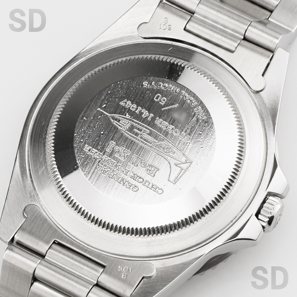外装ですが、裏蓋に細かな打ち傷が多数見受けられ、文字盤(GMTのM)のプリントにかすれがございます。ガラスの表面とベゼルに多数の打ち傷が見受けられます。