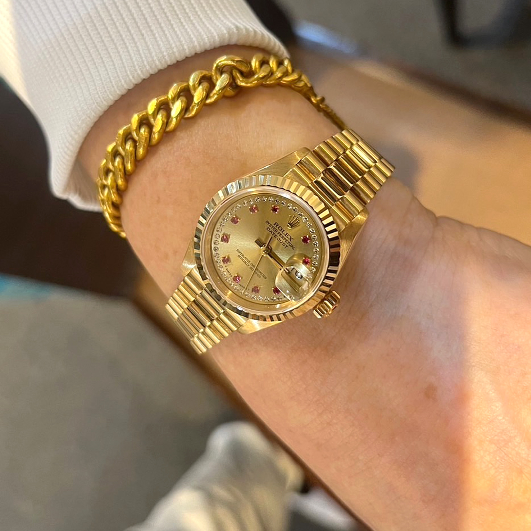 こちらの個体は2003年頃から2014年頃まで製造されていた旧型モデル。ロレックスの3大発明である「防水ケース」「自動巻き機構」「カレンダー機構」を搭載したデイトジャスト。レディースモデルの中で圧倒的な人気を誇り、素材・ダイヤル・サイズのバリエーションは他のモデルと比べ、数多く存在しております。ドームが型のスムースベゼルに、無垢専用のプレジデントブレスが装着。ケースやブレスには腕時計の素材としては最高峰にあたるプラチナ素材のみで構成され、ダイヤルはピンクシェル・デコレーションローマがセットされた大変希少な1本です。