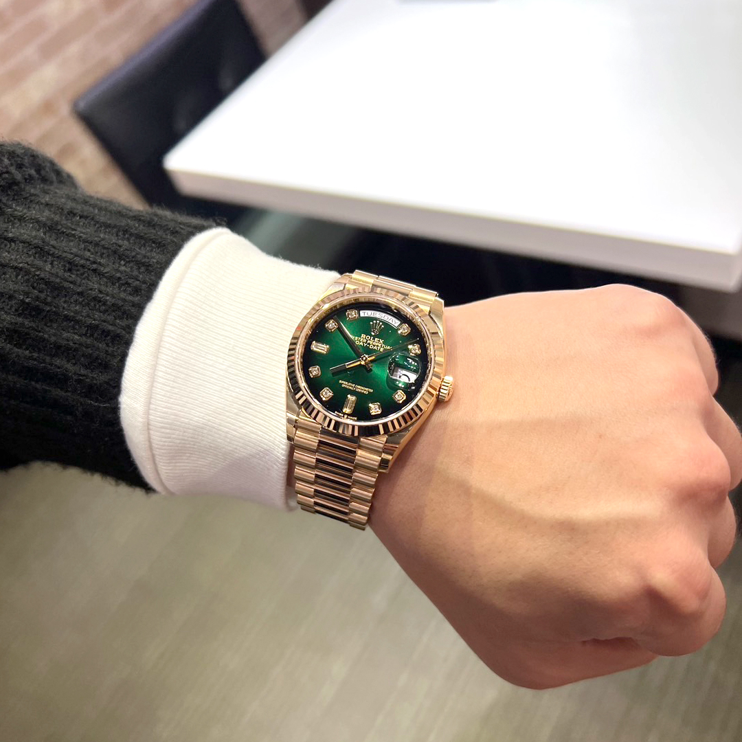 こちらの個体は2019年に発表された現行モデル。生産が終了となったRef.116234の後継機として製造され、ラグやケース形状の変更が加えられ、長時間パワーリザーブの新ムーブメントCal.3235を搭載。山形に等間隔でカッティングされたギザギザの刻みのフルーテッドベゼルに、復活したオイスターバックルのジュビリーブレスが装着。ベゼルにはホワイトゴールドを使用し、ダイヤルは残念ながら2021年に生産が終了してしまったピンクコンピューター・ダイヤがセットされた希少な1本です。