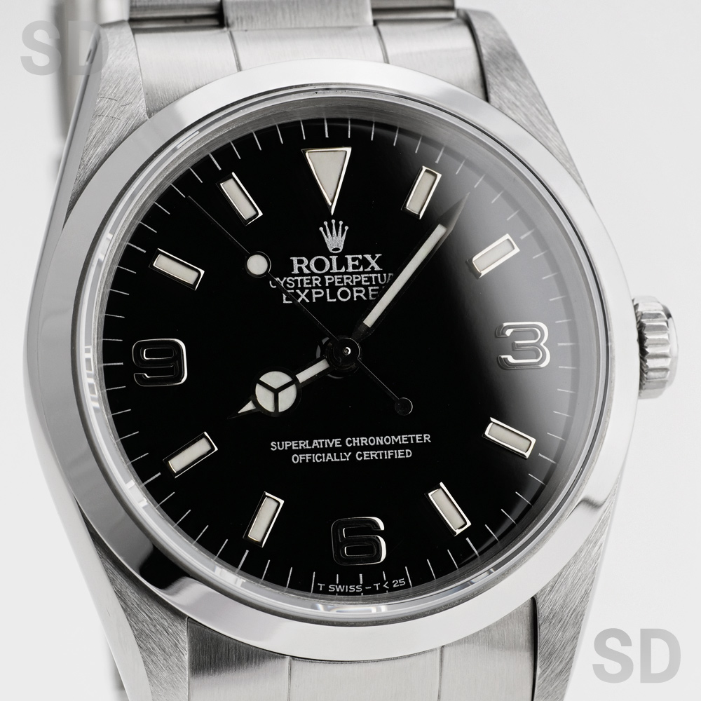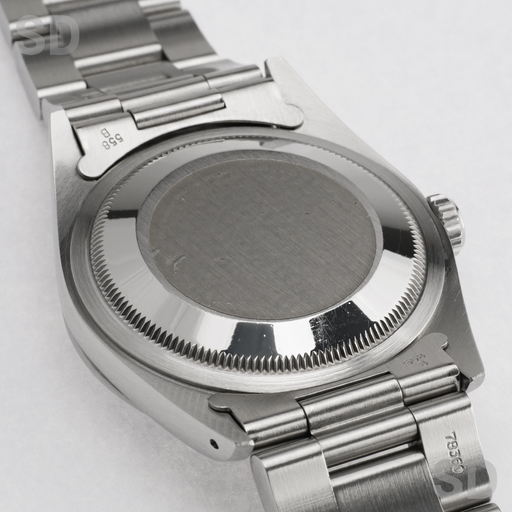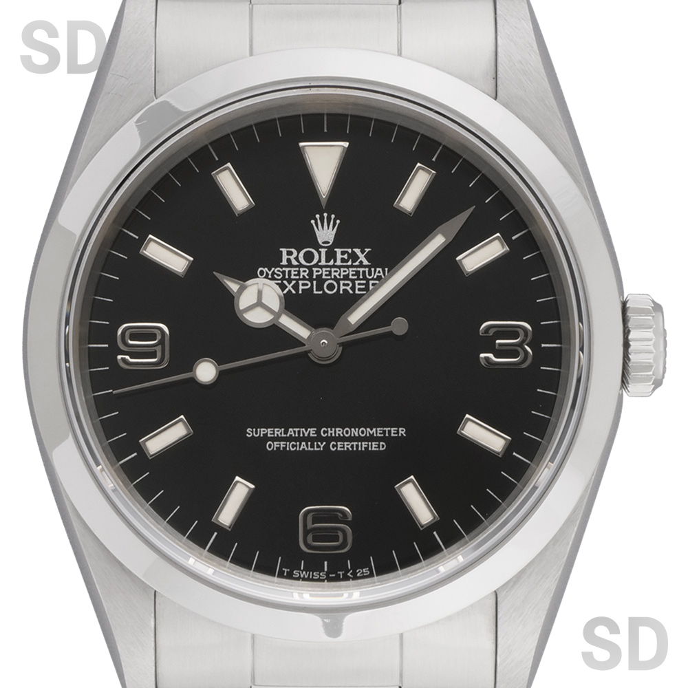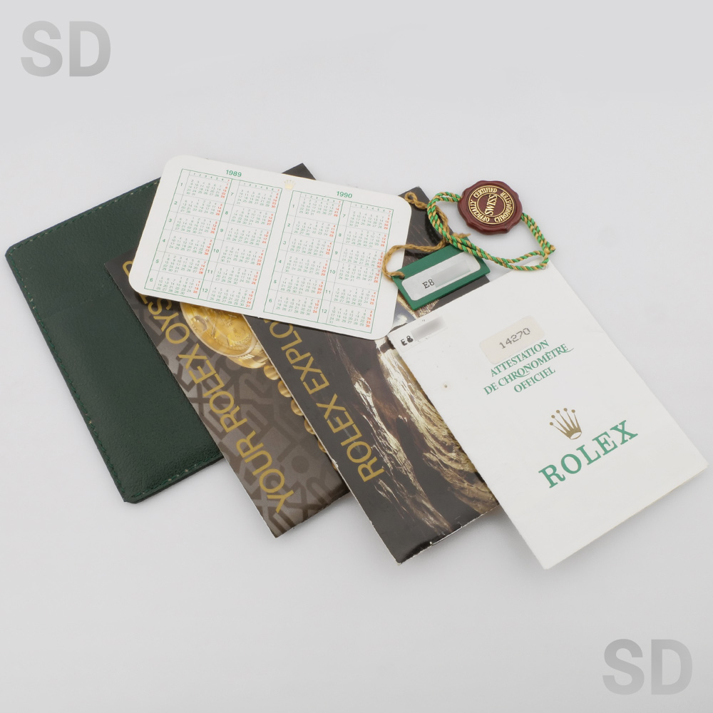 こちらの個体は3・6・9のインデックスに黒いラインが入る「ブラックアウト」ダイヤルに、ロゴマークや文字等が銀色になっている「シルバーレター」の希少性が高いタイプ。ムーブメントはcal.3000が搭載され、ブレスレットナンバーは78360のシングルロックのブレスが装着。フラッシュフィットナンバーは558B、クラスプにはP4(1991年)の刻印がされております。また、付属品として国際保証書、BOX(内箱、外箱)、パスケース、カレンダー(1989年、1990年)、シリアルナンバー入りタグ、小冊子(ROLEX EXPLORER、YOUR ROLEX OYSTER)が付いております。