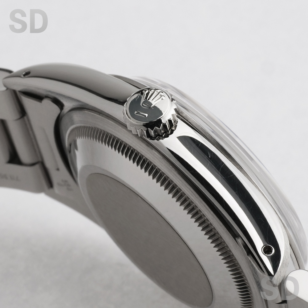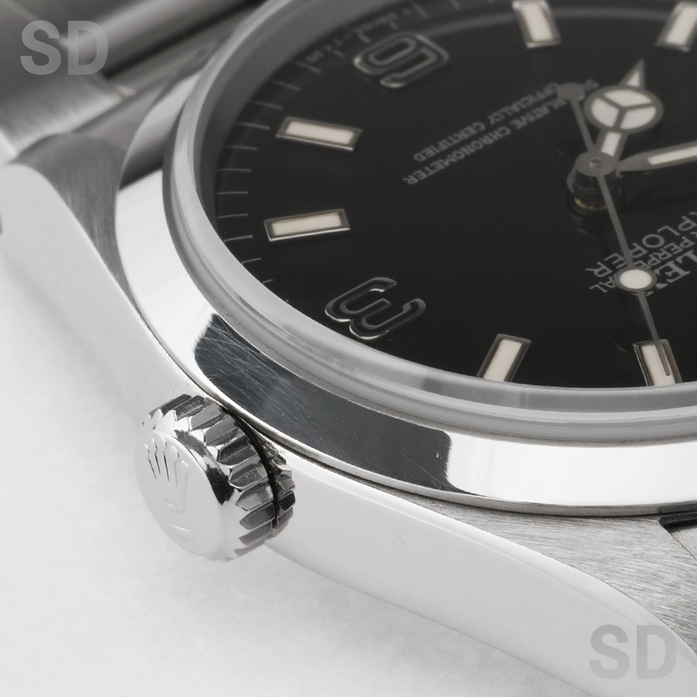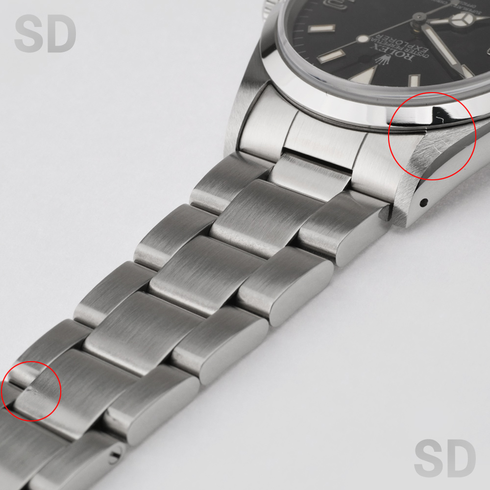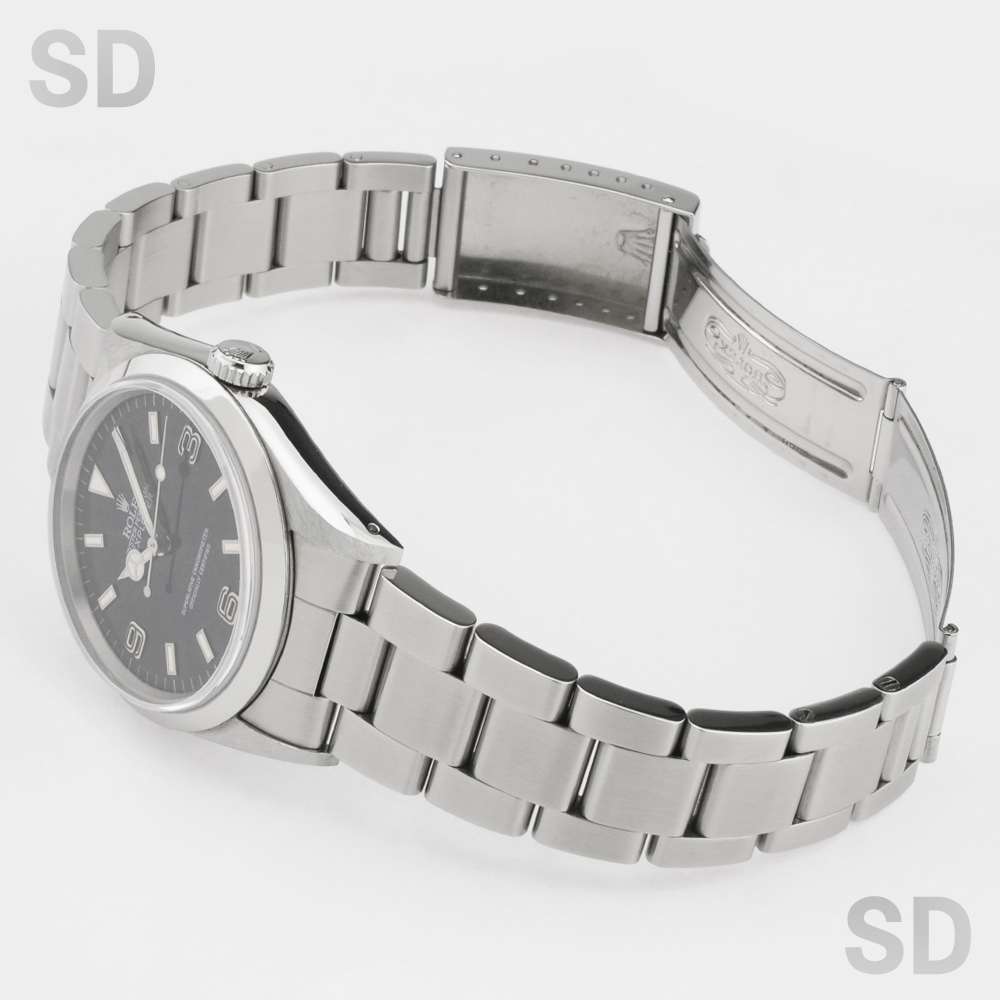 こちらの個体は3・6・9のインデックスに黒いラインが入る「ブラックアウト」ダイヤルに、ロゴマークや文字等が銀色になっている「シルバーレター」の希少性が高いタイプ。ムーブメントはcal.3000が搭載され、ブレスレットナンバーは78360のシングルロックのブレスが装着。フラッシュフィットナンバーは558B、クラスプにはP4(1991年)の刻印がされております。また、付属品として国際保証書、BOX(内箱、外箱)、パスケース、カレンダー(1989年、1990年)、シリアルナンバー入りタグ、小冊子(ROLEX EXPLORER、YOUR ROLEX OYSTER)が付いております。