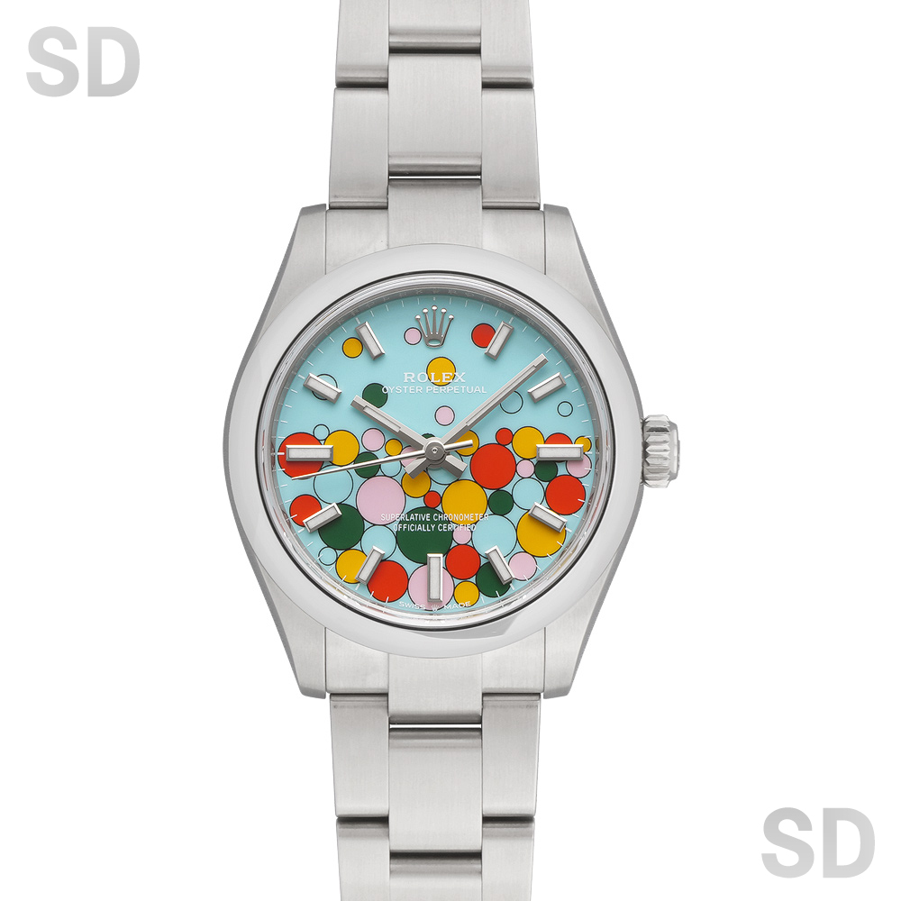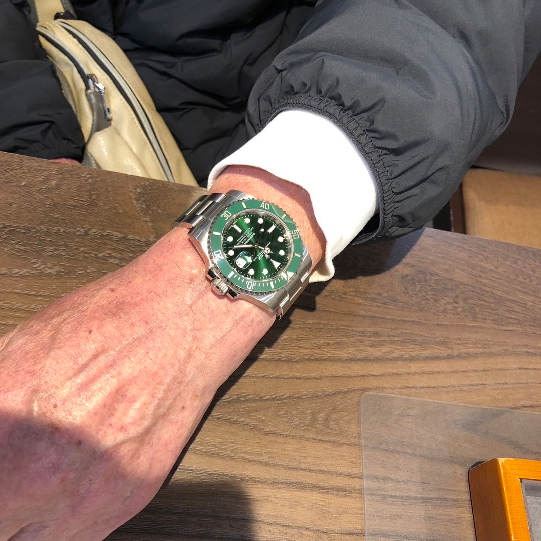 状態です。ベゼルはエッジ痩せを防ぐため、あえて仕上げ(研磨)は施しておりません。その他外装は修理工房にて研磨済みですので擦り傷小傷が僅かに残る程度で特筆すべきダメージは見受けられません。メーカー出荷時の保護シールが数か所残っており、大変綺麗なコンディションです。内部は弊社にて動作チェックを行い、精度、リューズ操作ともに問題ございませんでした。付属品は国際保証カード、シリアルナンバー入りタグ、ロレックス純正BOXが付いております。