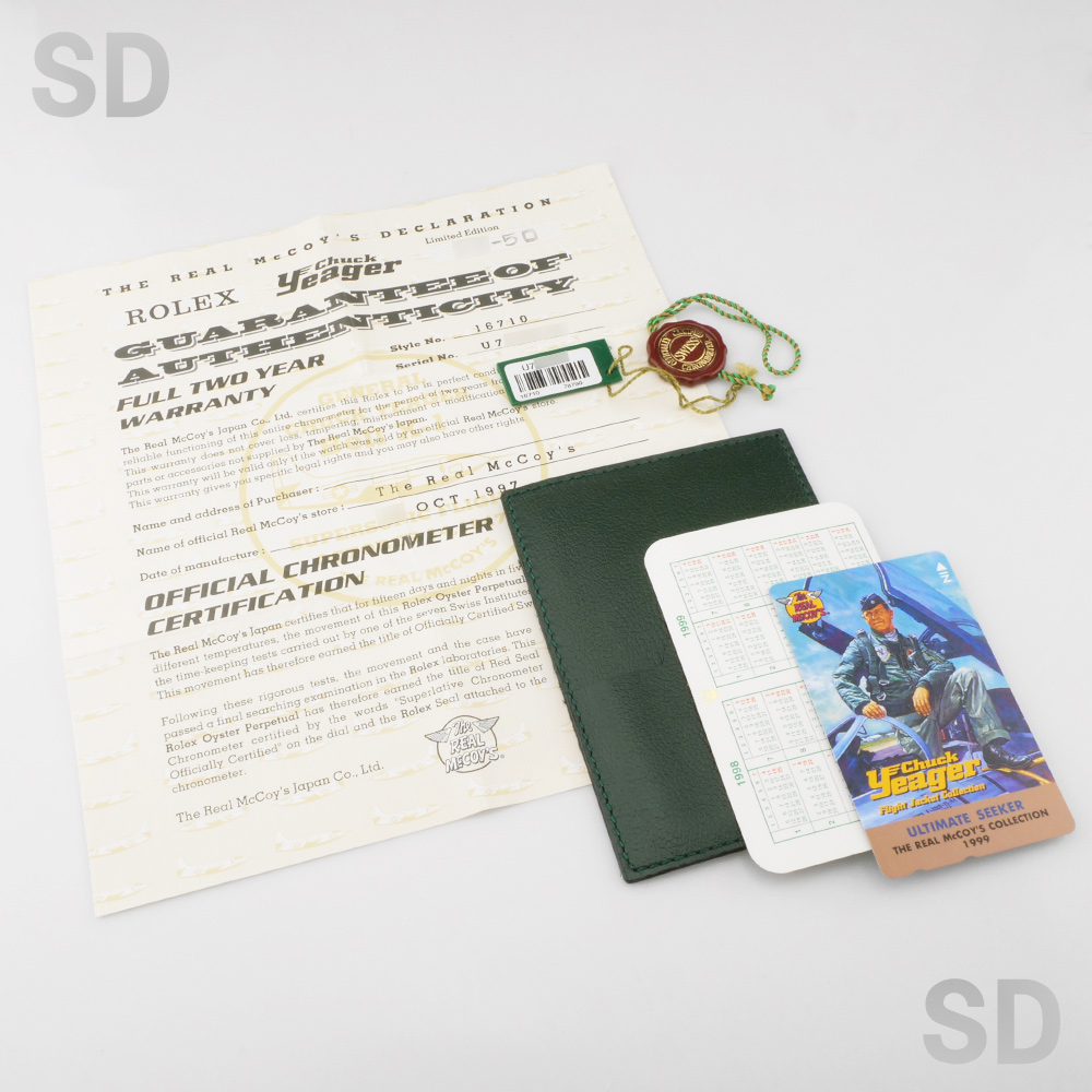 付属品として保証書(リアルマッコイズ社製、1997年10月の日付)、BOX(外箱にRefシール、ベゼルカラーシールあり)、パスケース、カレンダー(1998年、1999年)、シリアルナンバー入りタグ、クロノメータータグ、テレフォンカード(チャックイエガー)が付いております。
