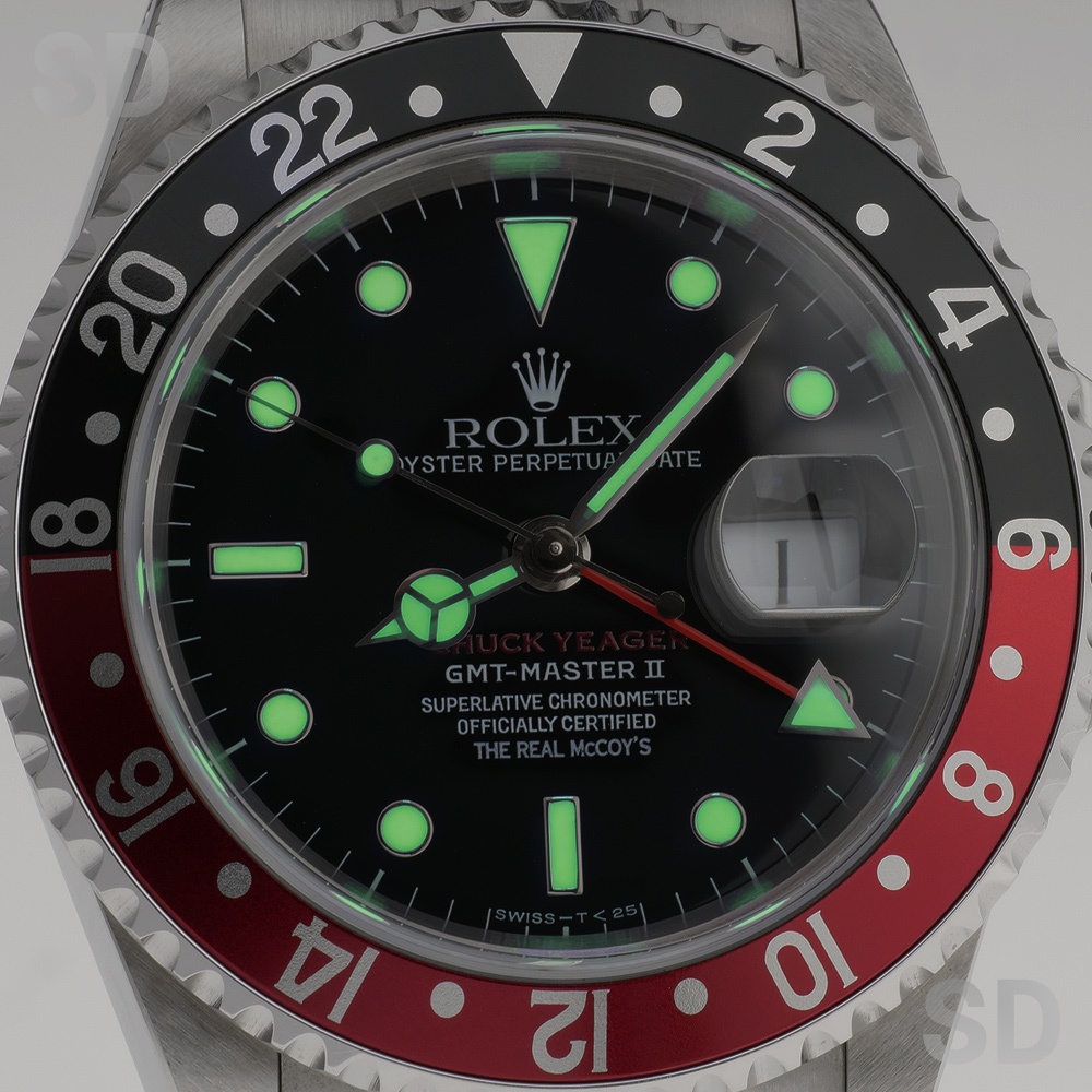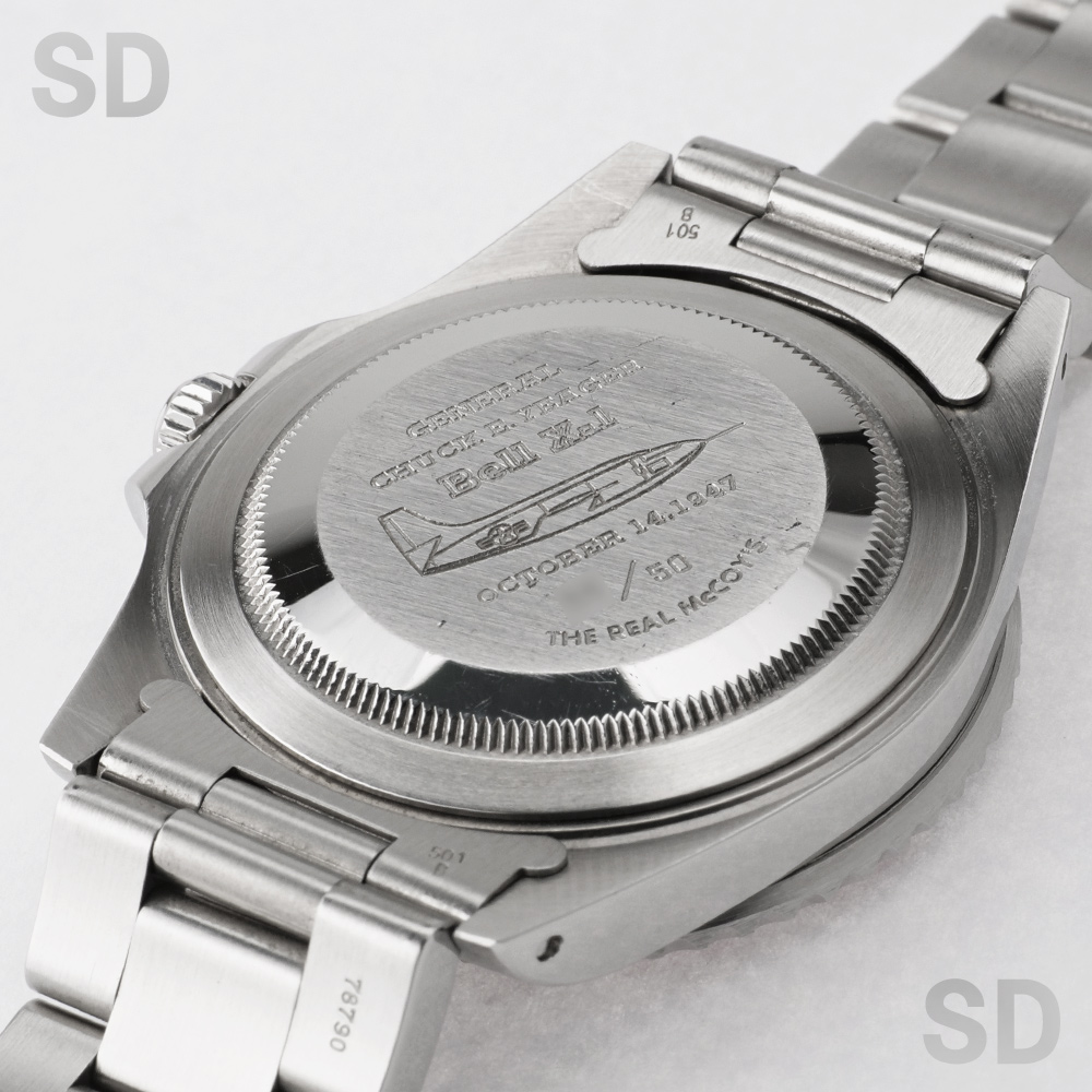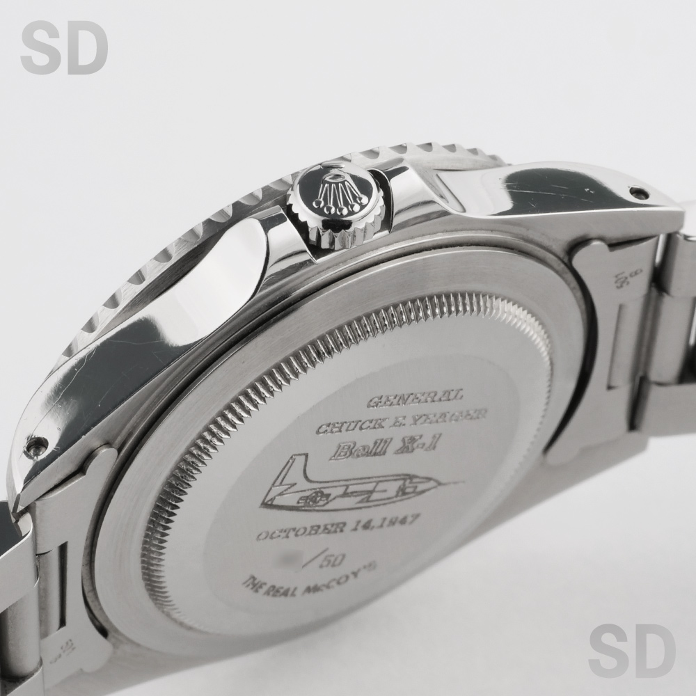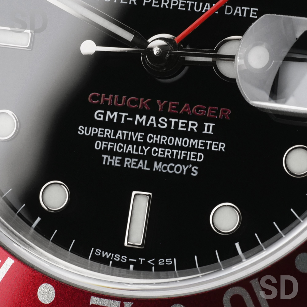 今回ご紹介するモデルは人類史上初めて音速飛行を成し遂げた元アメリカ空軍パイロットのチャック・イェーガーの音速突破50周年記念式典(1997年)を記念して「リアルマッコイズ社」が企画したチャック・イェーガーのダブルネームです。このモデルは1997年に発売されたファーストモデルで、Ref.16710赤黒ベゼル、Ref.16700赤青ベゼル、Ref.16700黒ベゼルで、それぞれ限定50本製造されました。