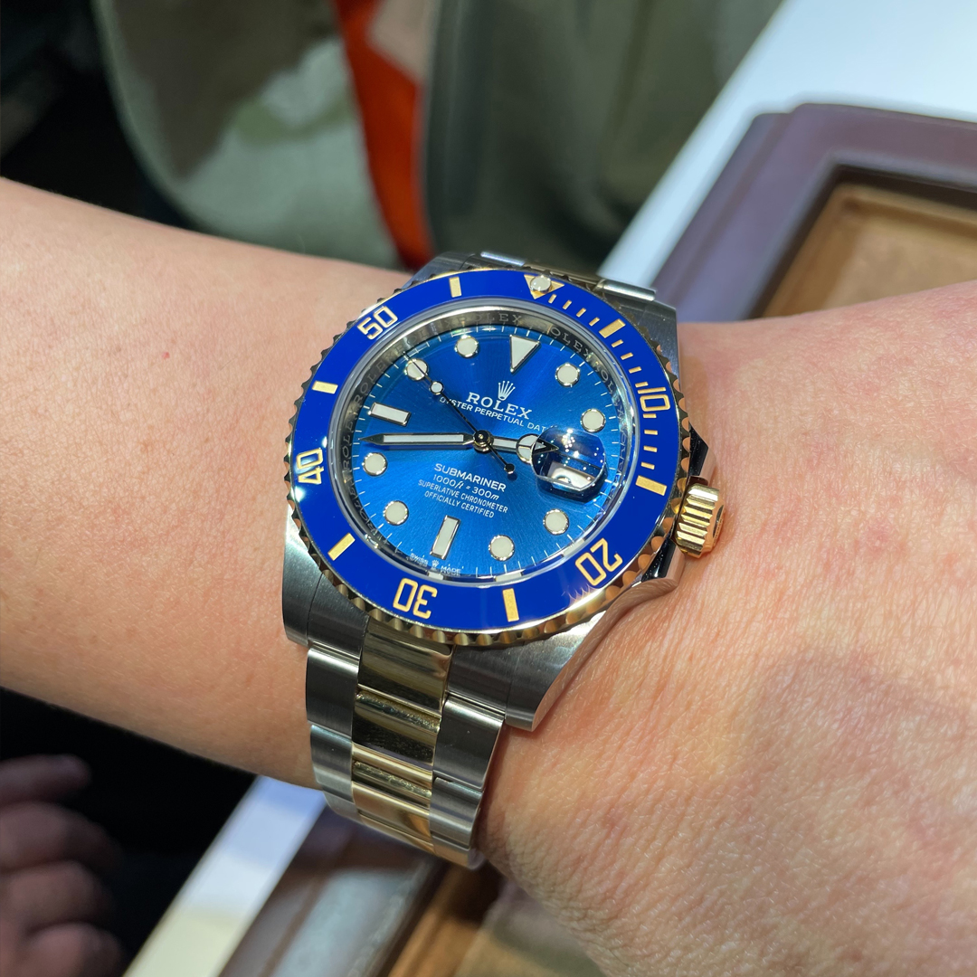 保護シールには一部剥がれや欠けがございます。また、ブレスレットやベゼルには細かな小傷があり、ブレスレットサイズの調整痕がございます。